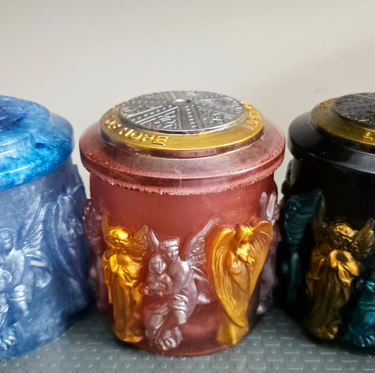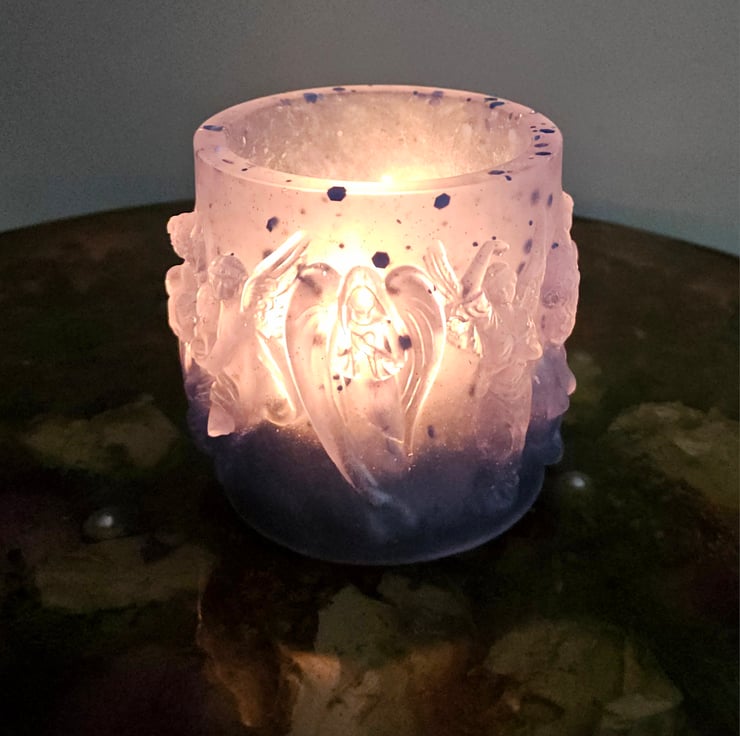 Embossed Angel candle jar/cup with lid. Handmade from high quality epoxy resin. Looks amazing with tea light.