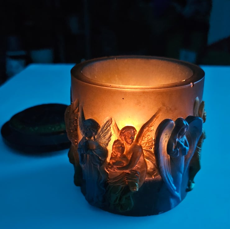 When tea light is lit- candle cup just looks glorious. I feel like I am being watched over by Angels.