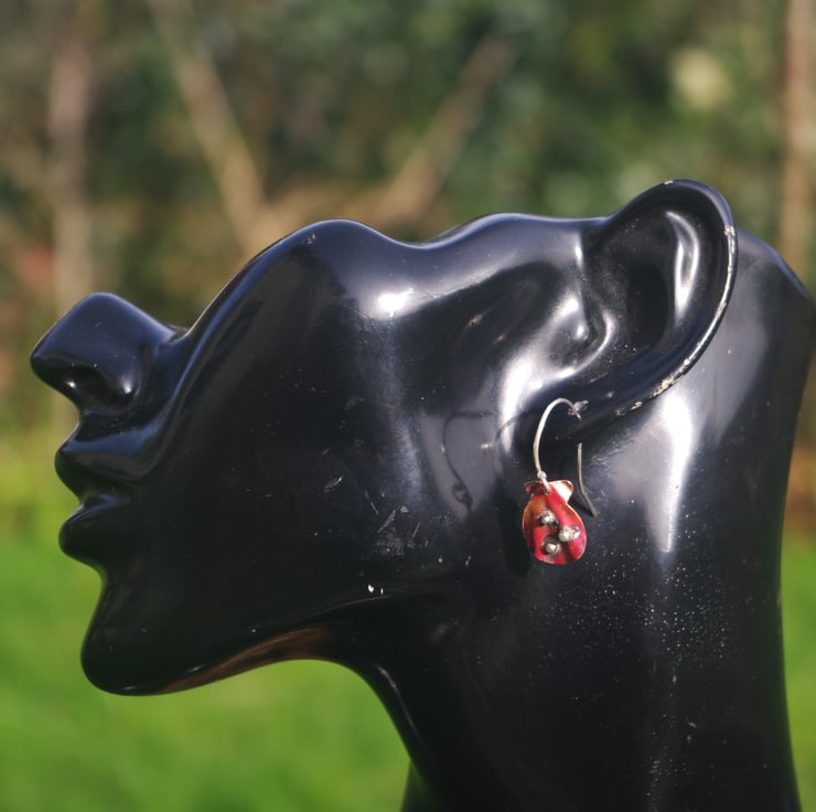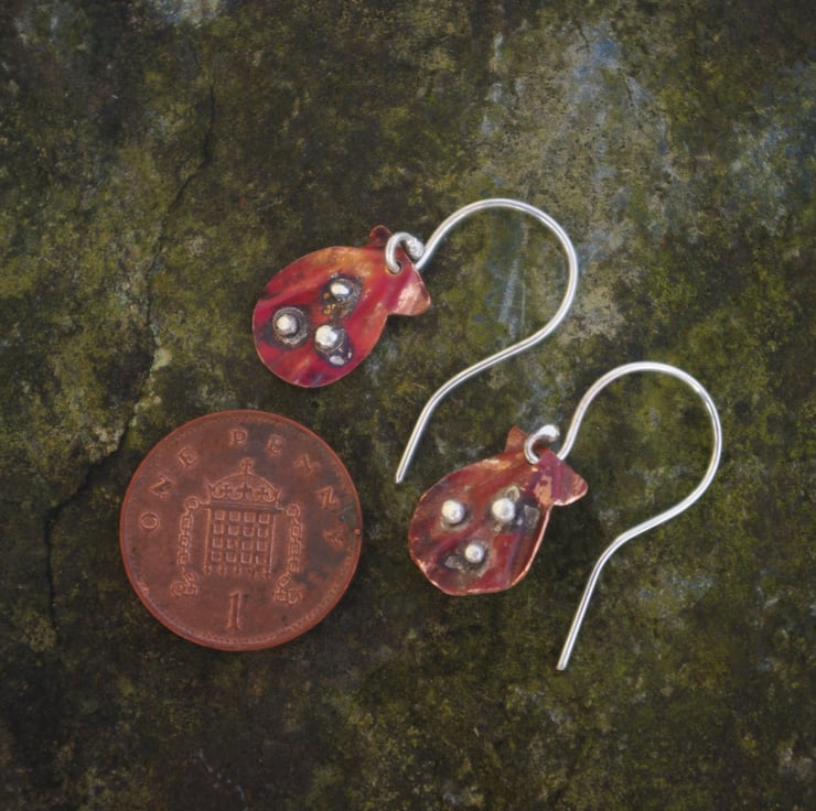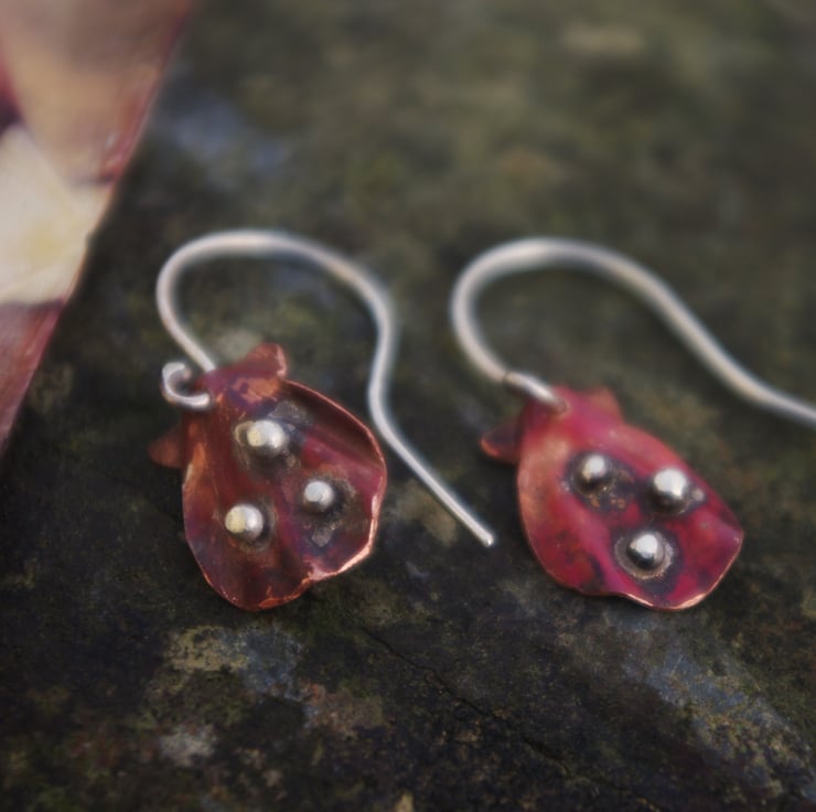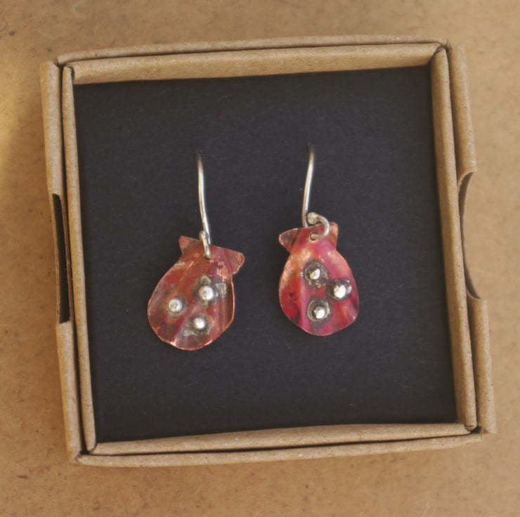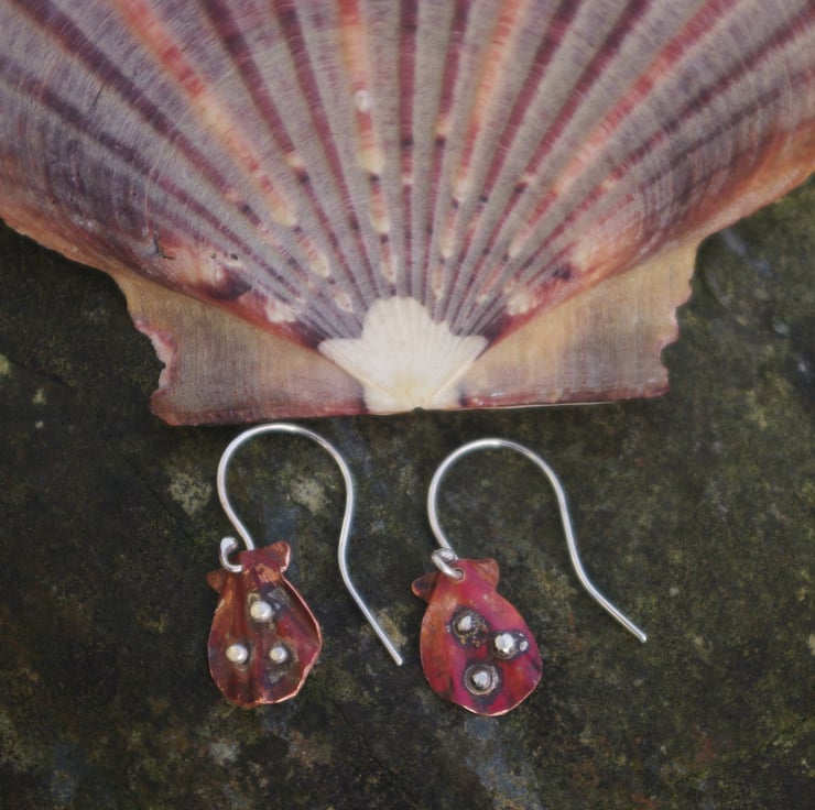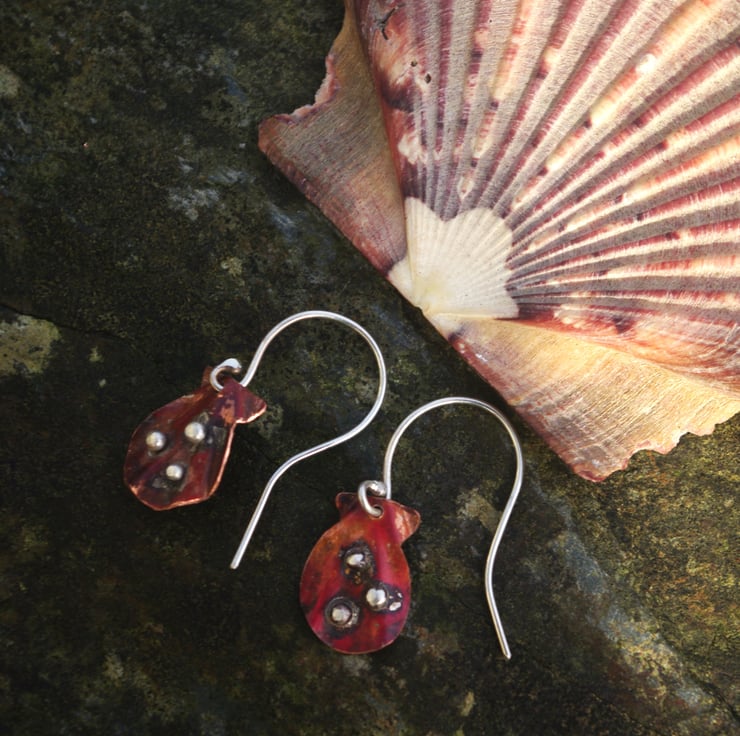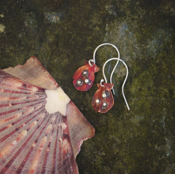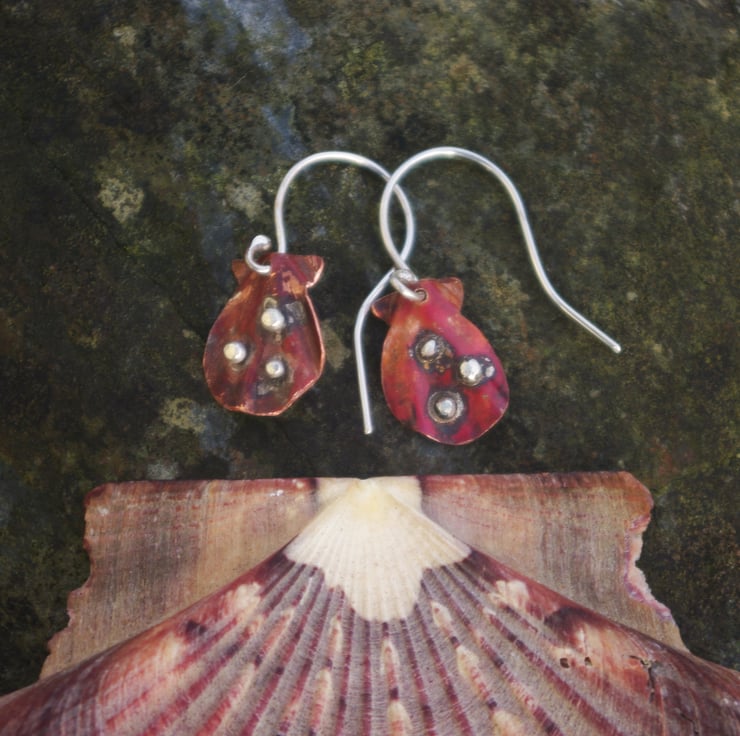 Copper shells with silver barnacles . The copper has gained deep and luscious red tones through heat . The shells hang from sterling silver handmade ear hooks . The total dangle is 28mm/ just over an inch .