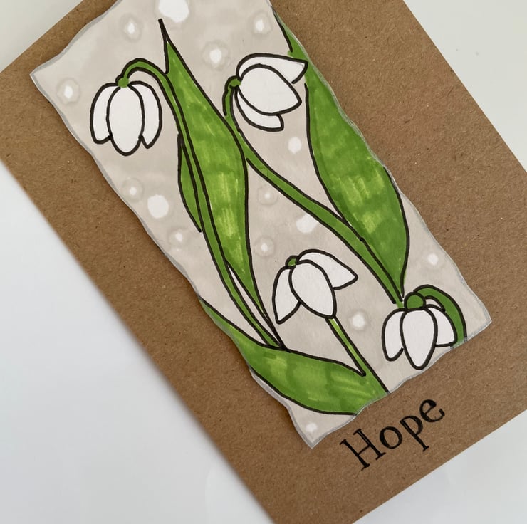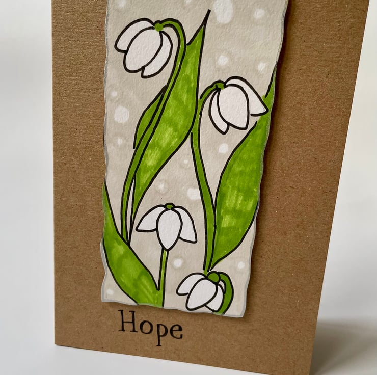 The card is made using a hand drawn illustration of a group of snowdrops. I have attached it to a natural coloured recycled card blank using sticky fixers to give it a slightly 3D look. Beneath this I have written “Hope” in black ink.