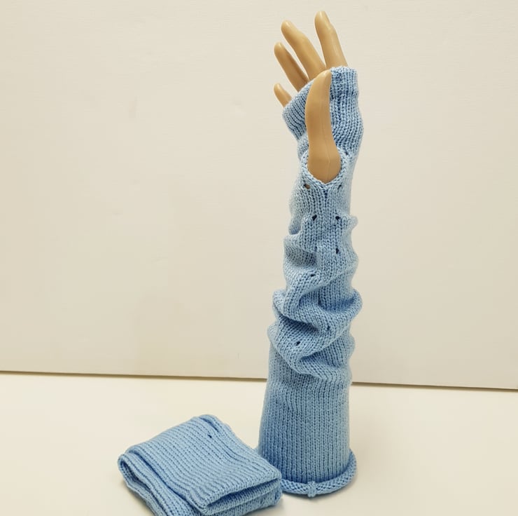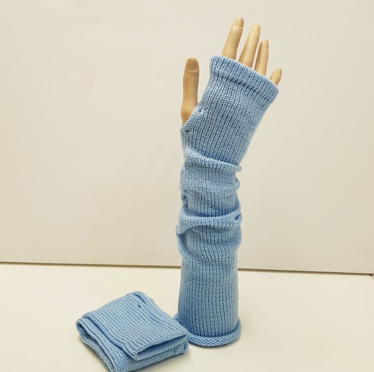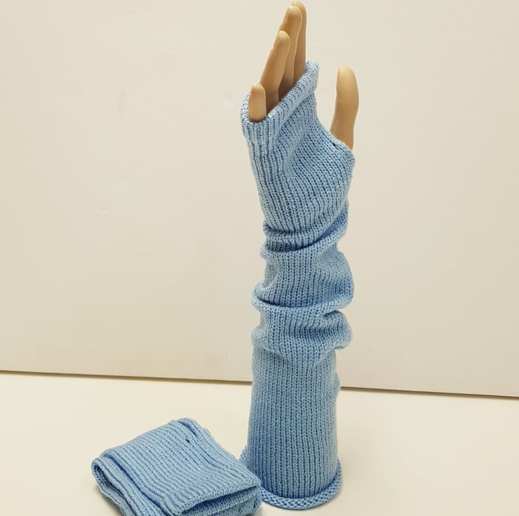 Handmade knitted sky blue long wrist warmers for women, knitted hand warmers, finger less gloves.