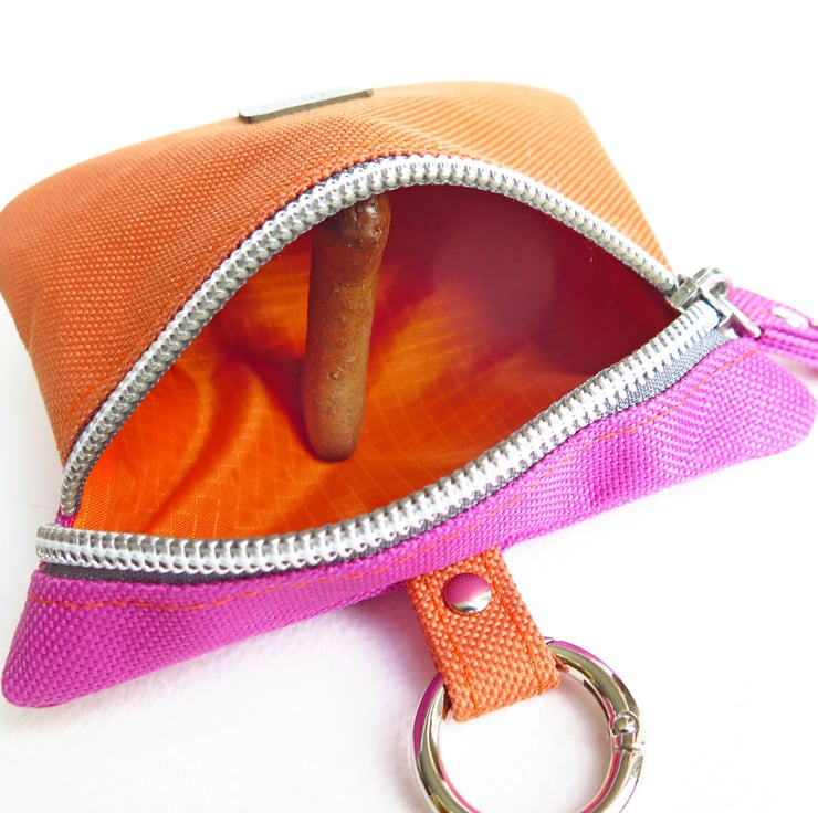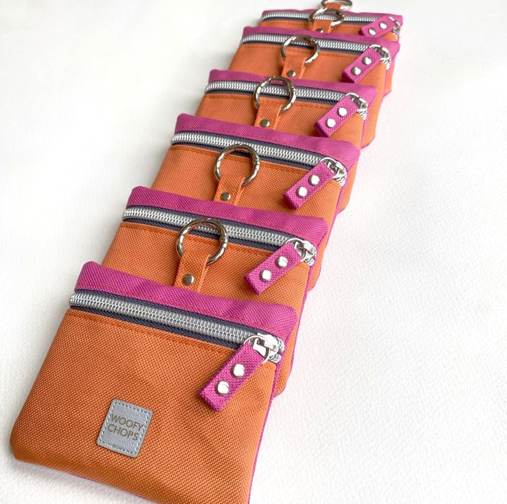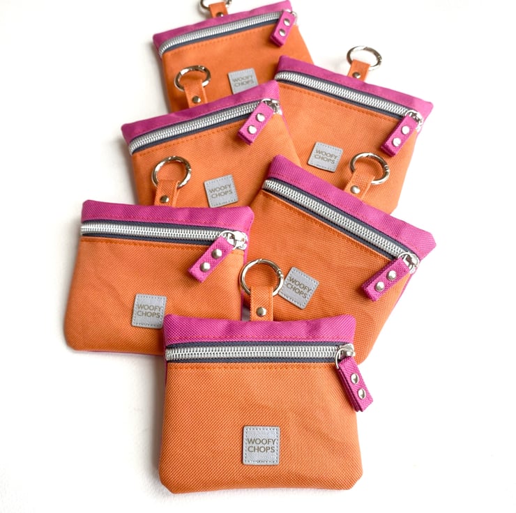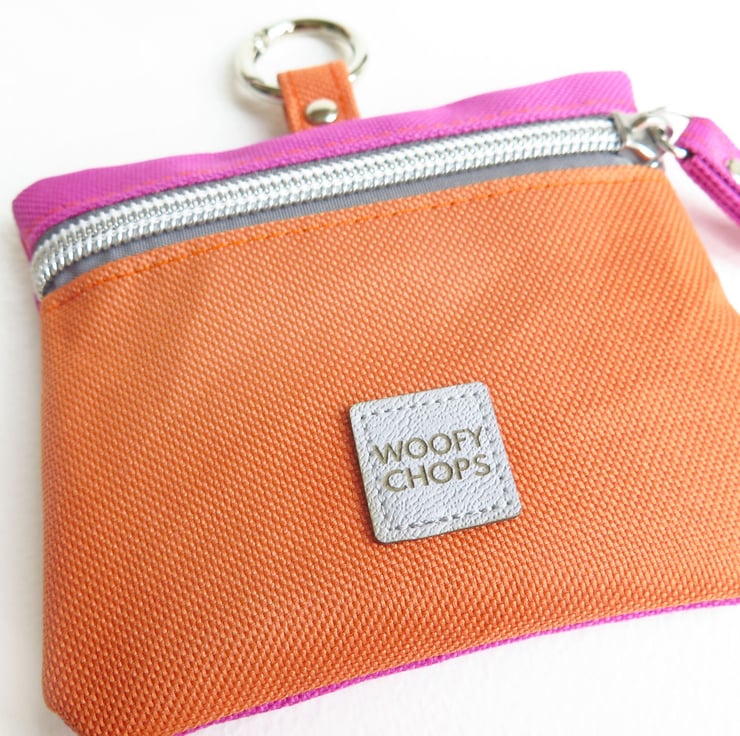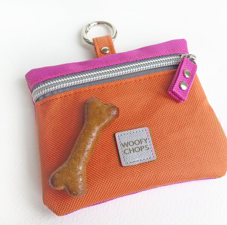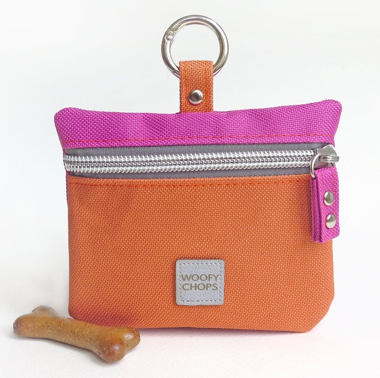 This treat bag is made from a durable waterproof exterior material, they also come with the O-ring sprung carabiner clip already attached for you, so all you need to do is just clip it onto your belt hooks or bag/rucksack and it'll keep your dog treats and/or poo bags not only dry but right to hand when you need them.