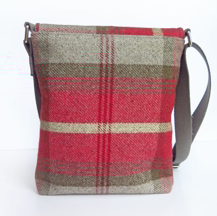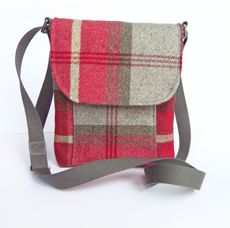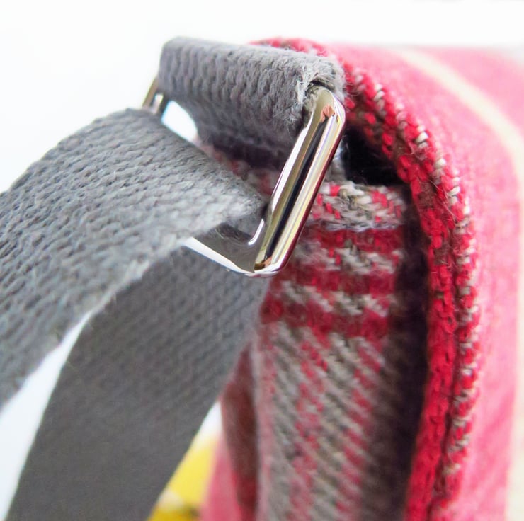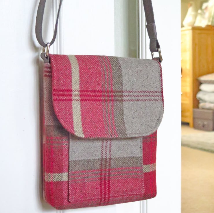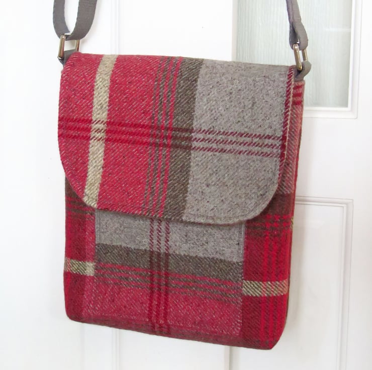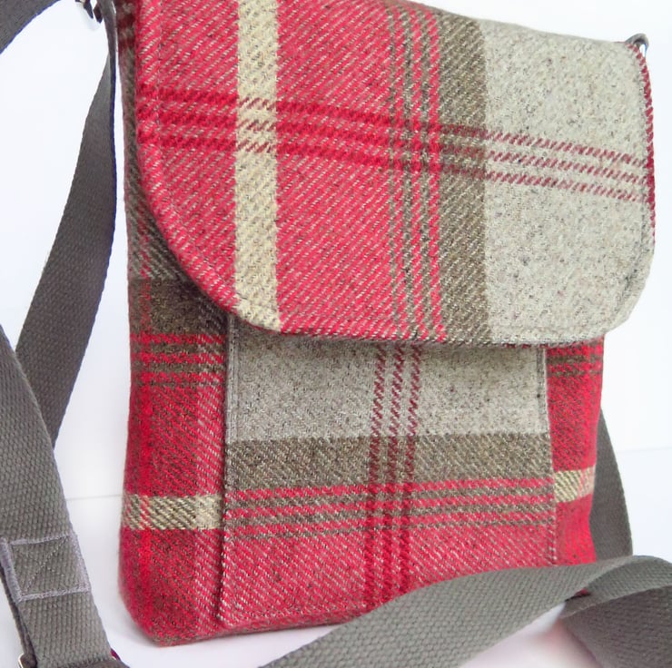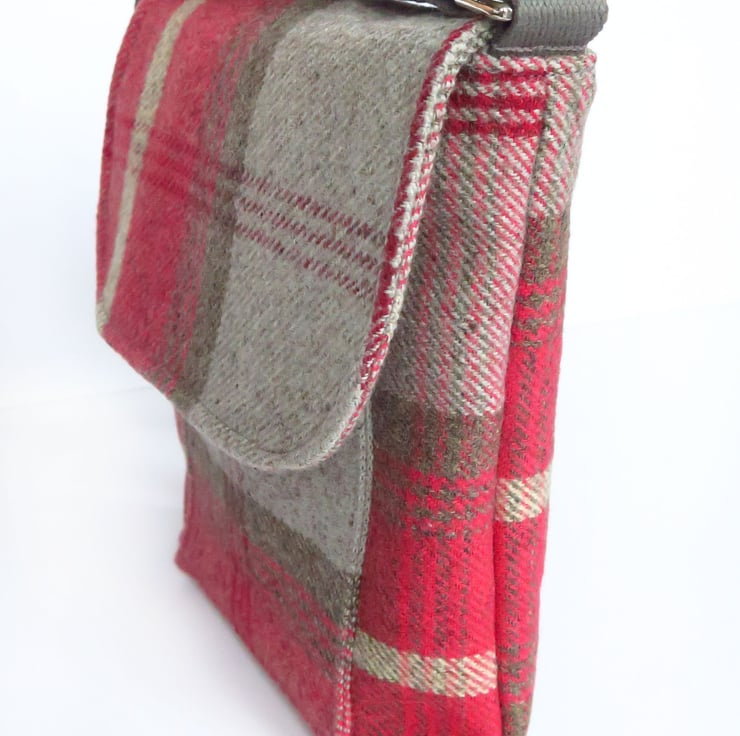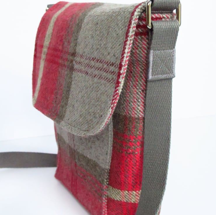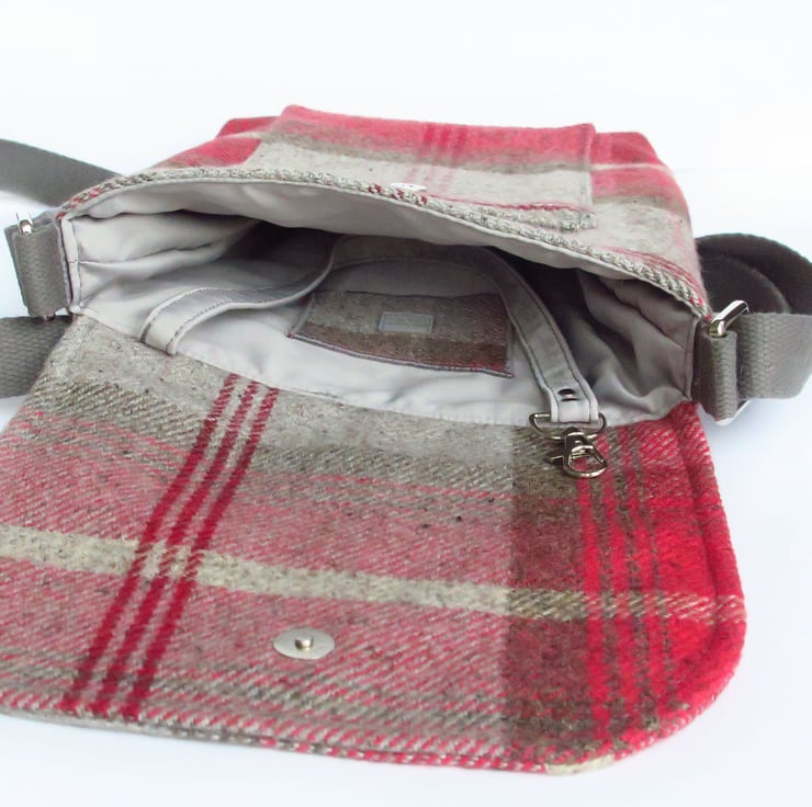 This is a lovely soft red and grey fabric tartan messenger bag, with a padded fleece inside to give it a bit of body and softness. It has a silky grey sateen fabric interior which compliments the grey tones in the exterior, which is a polyester cotton mix fabric.