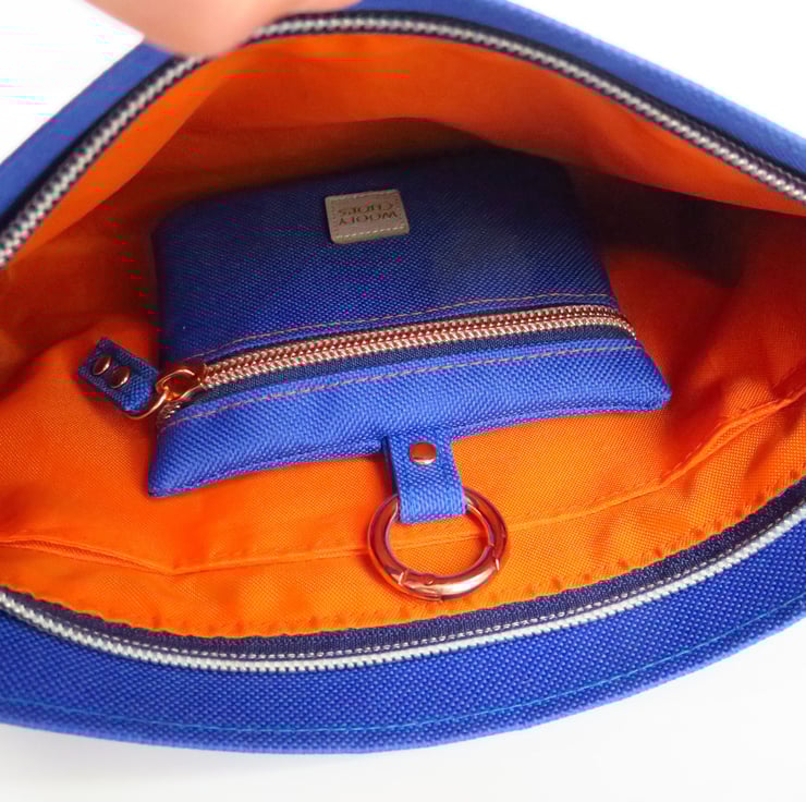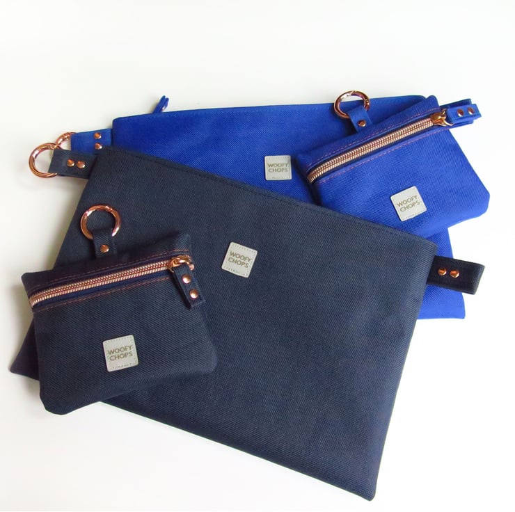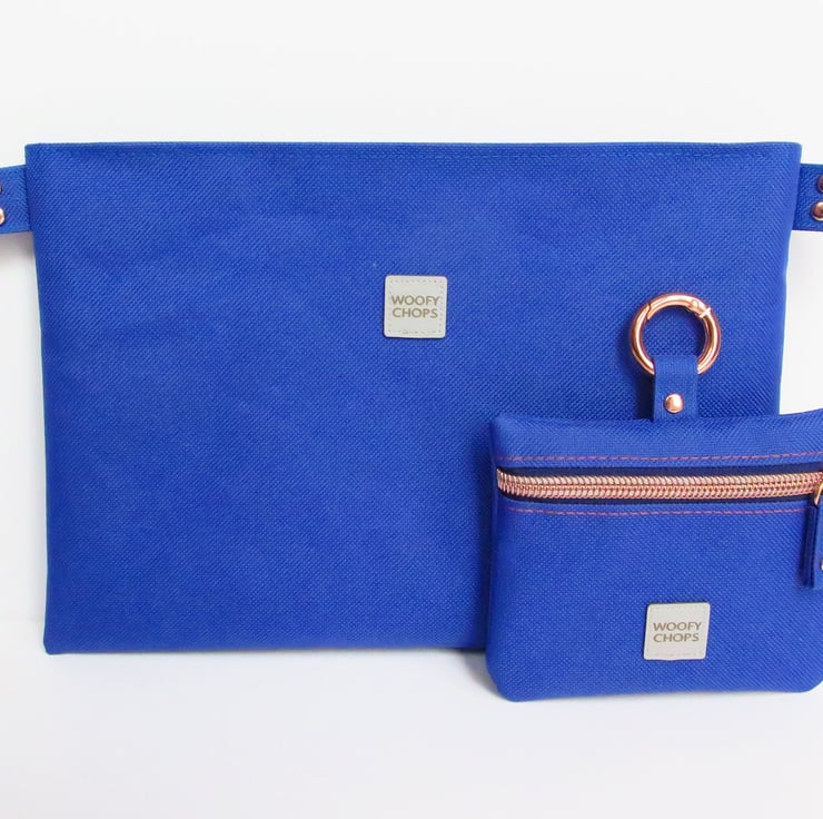 ROYAL BLUE pouch and matching Royal Blue treat bag, both with rose gold zips, rivets and carabiner.