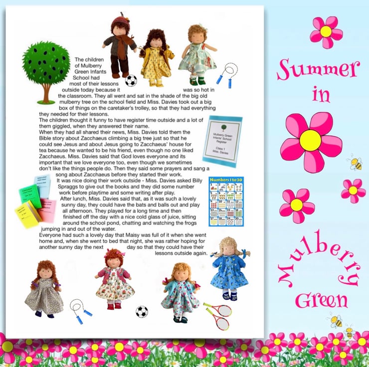 There are other children in Maisy’s class at school - Violet, Billy with his pet rabbit, Amber, Tilly, Rosie and her kittens, Amelia, Ruby, Marigold, Bobby with Max the dog, and the twins Oliver and Olivia, who have a puppy called Oscar. The dolls are all 26cm tall and baby Daisy is 16cm. Maisy and Mo love nothing more than having adventures with their friends. You can read about their adventures on my Facebook and Instagram pages - Maisy Muffin Rag Dolls and on my Mulberry Green Pinterest boards.