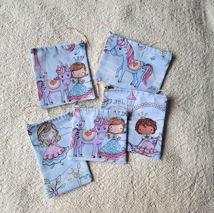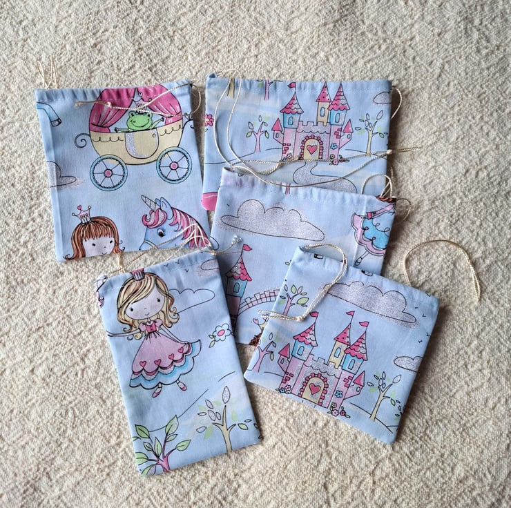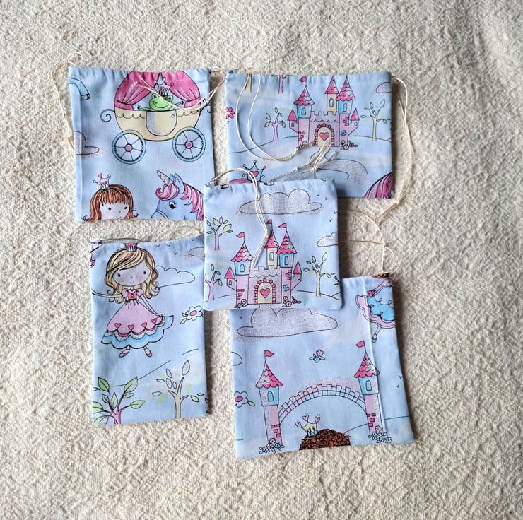 This pack of five small pale blue drawstring bags should appeal to almost any little girl. They depict princesses with sparkly crowns and dresses, unicorns with sparkly horns and tails, glittery castles and clouds. One even shows a smiley green frog in a carriage! I have made them of good quality quilting cotton, so they can be repeatedly used, washed and ironed as necessary. The largest measures 4.5" (11.5 cm.) by 5" (13 cm.) and the smallest 4" (10 cm.) square