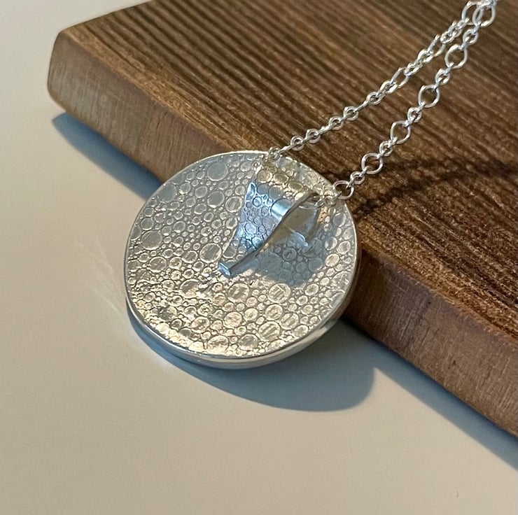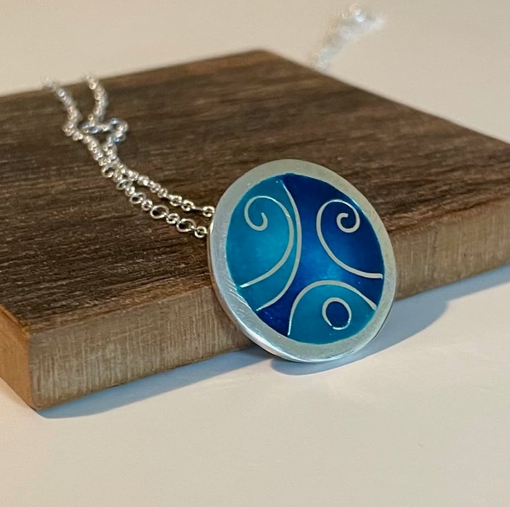I'm really pleased with how this pendant has turned out. It has a base of fine silver with fun 'bubble' texture on the reverse and pretty bail. The enamel on the front uses just 2 enamel colours, but by layering differently it almost looks as if many more tones have been used, with swirls used to separate the colours incorporating the cloisonné enamel technique. It comes hanging from an 18inch sterling silver chain.