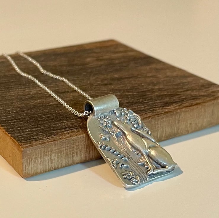 My new hare pendant! This rather lovely chap is made from fine silver and given a satin finish to show off all the lovely definition on both his body and all the flowers and butterflies.