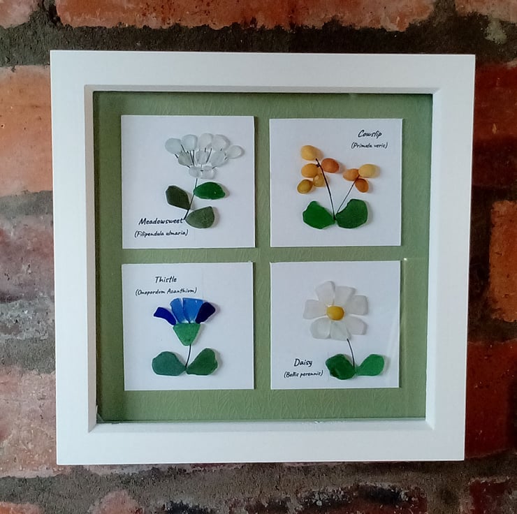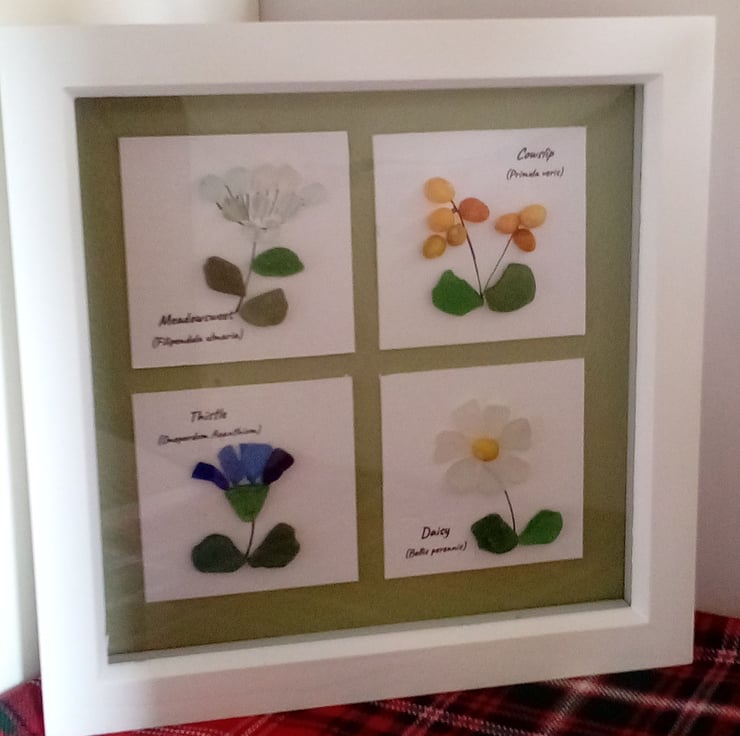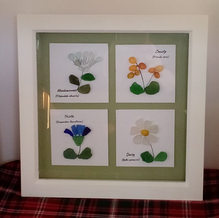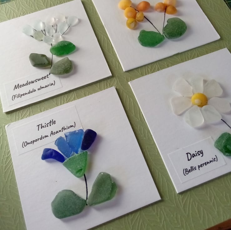 A selection of four wildflowers in Scottish SeaGlass and Seashells.