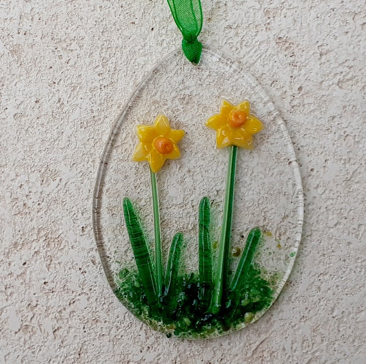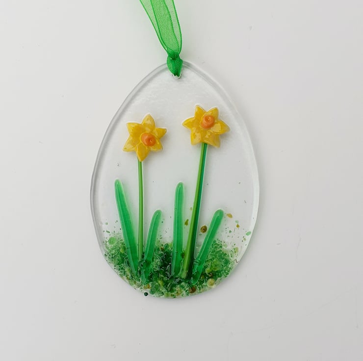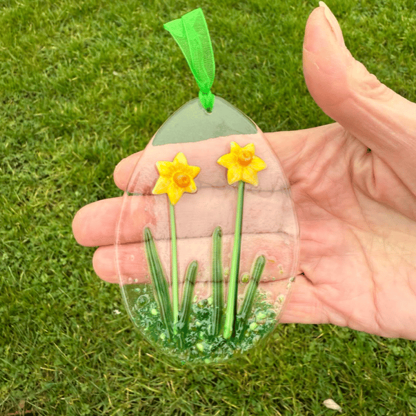 The daffodils have been created from glass powder, which was shaped in a mould and fused together, and then laid out on a base of clear glass, decorated with crushed coloured glass and coloured vitrigraph and kiln-fused again. Drilled and strung with a vivid spring green organza ribbon, the egg is ready for hanging. The decoration measures 9 x 6cm max and will be sent in a letterbox size box.