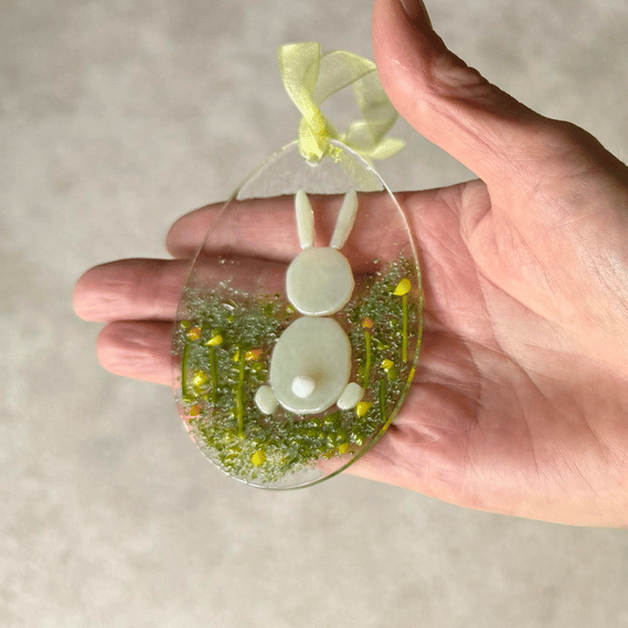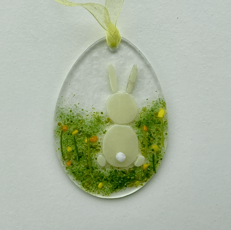 The glass egg is cut from clear glass and decorated with coloured glass powders, chips, murrini and vitrigraph. The rabbit is cut from cream glass and has a little white tail. The decorated egg has been fused in my kiln to 745 degrees, a temperature which allows the separate pieces to fully fuse together, while maintaining texture. The decoration has then been drilled and threaded with a yellow organza ribbon, ready for hanging.