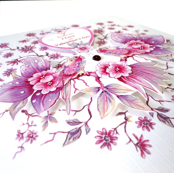 For Valentine’s Day we are always looking for that perfect card, traditionally red roses and hearts to express our love. But for a prettier very feminine option – this ‘Pink Love Birds Card’ in softer tones of pink, red, lilac, lemon and olive would definitely fit the bill! Hand-painted in gouache these love birds perched on branches of pink flowers are looking lovingly into each others eyes. With a pink edged heart this scene is hand-cut and mounted on a spaced floral background on white.