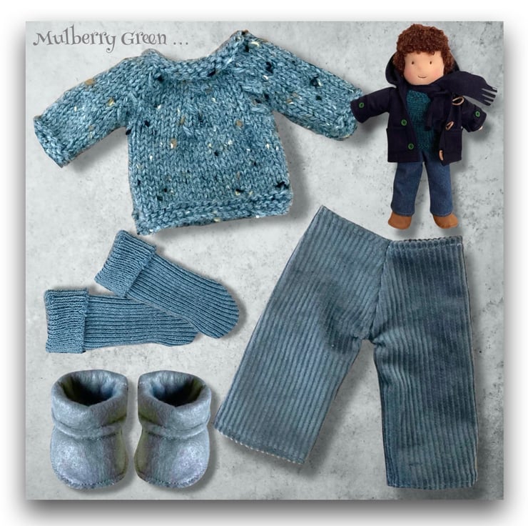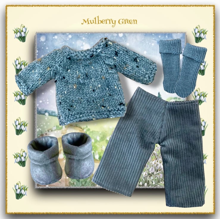 A lovely grey jumper in a flecked yarn, to fit the Mulberry Green characters. The jumper is hand knitted and fastens with a little popper.