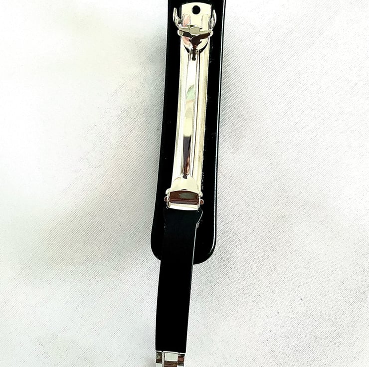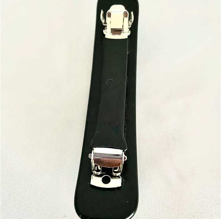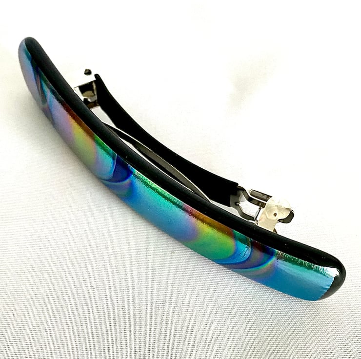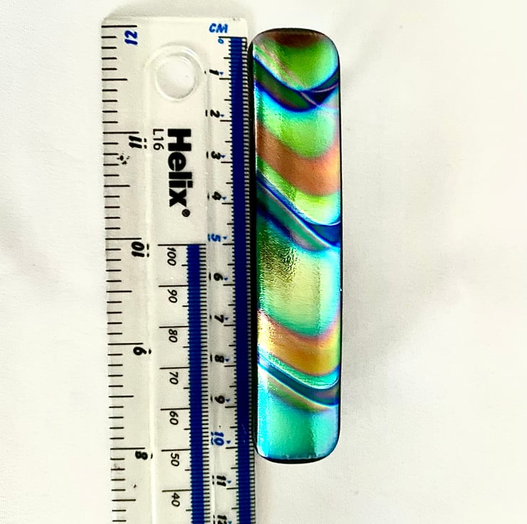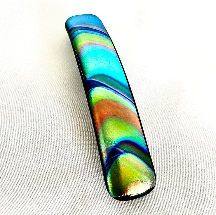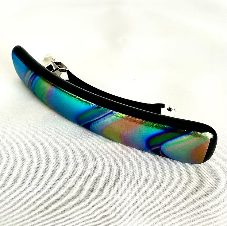 This unique hair barrette clip measures 10 cm long and is made with two sheets of art glass fused to one strip and firmly glued to a 8cm clip. The fusing took place in a specialist glass kiln fired to 780 degrees Celsius before slowly being cooled in a controlled programme to prevent thermal shock.