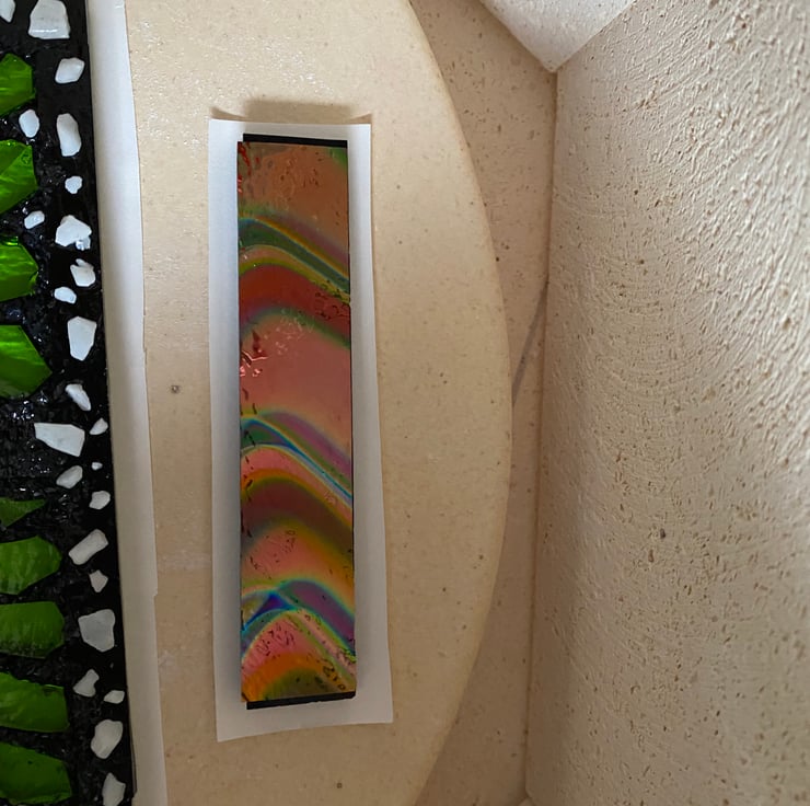 The top glass layer is a mesmerising and shimmering patterned dichroic glass called Twizzle. Whilst more expensive than usual art glass, the patterns, textures and shimmering, iridescent finish the glass offers is beautiful and well worth the price. This particular piece evokes all the colours of the spectrum with an aquamarine to green dominant colour.