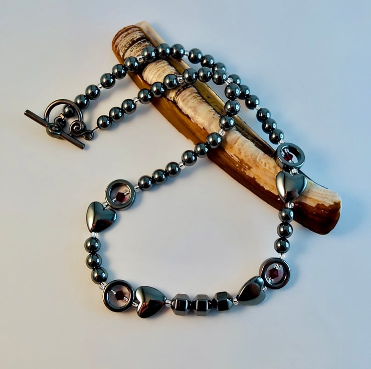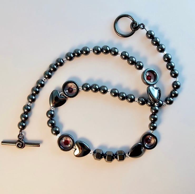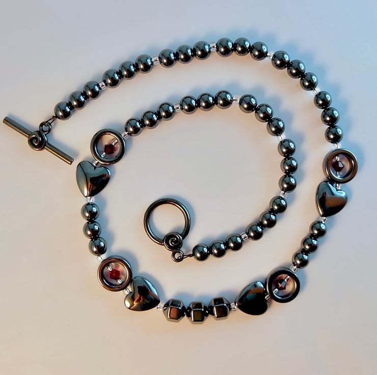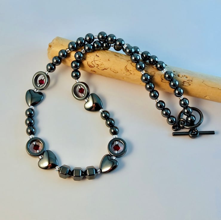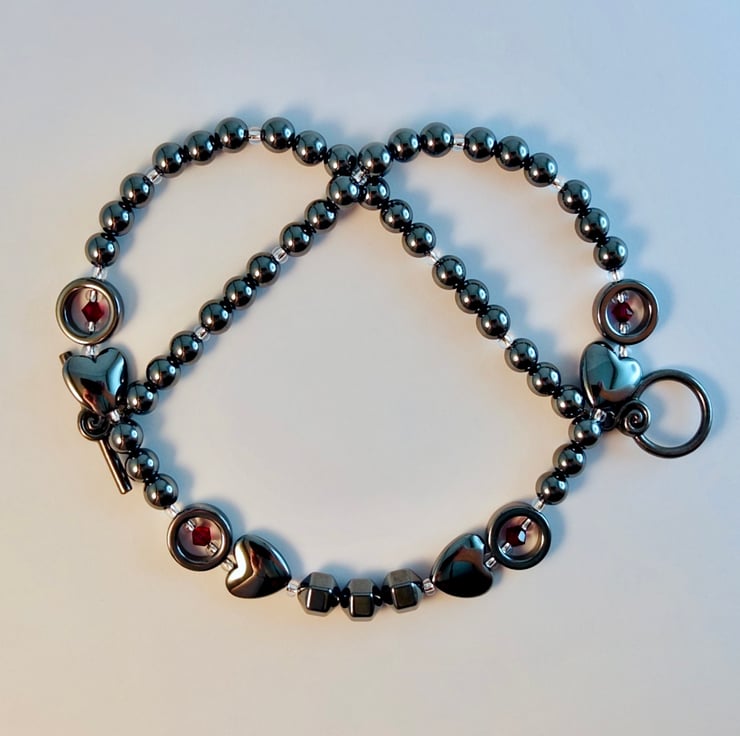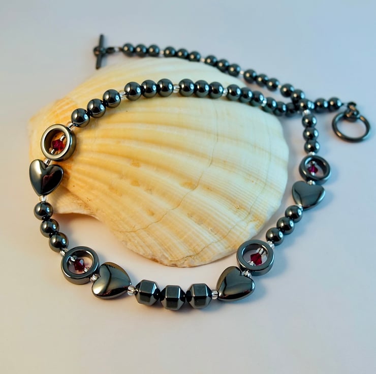 The gunmetal grey Hematite beads are very shiny, and the silvered seed beads and red crystals add a hint of sparkle and colour.