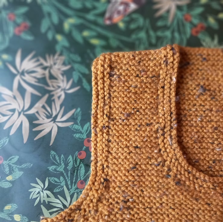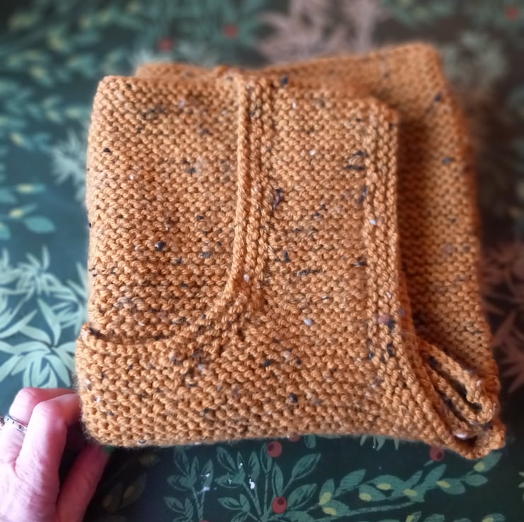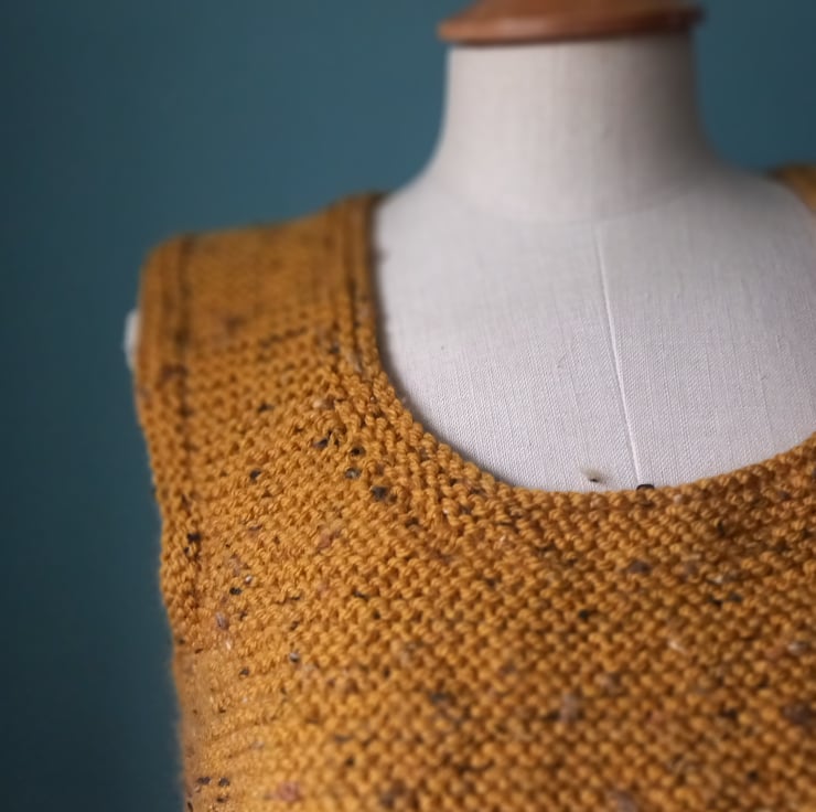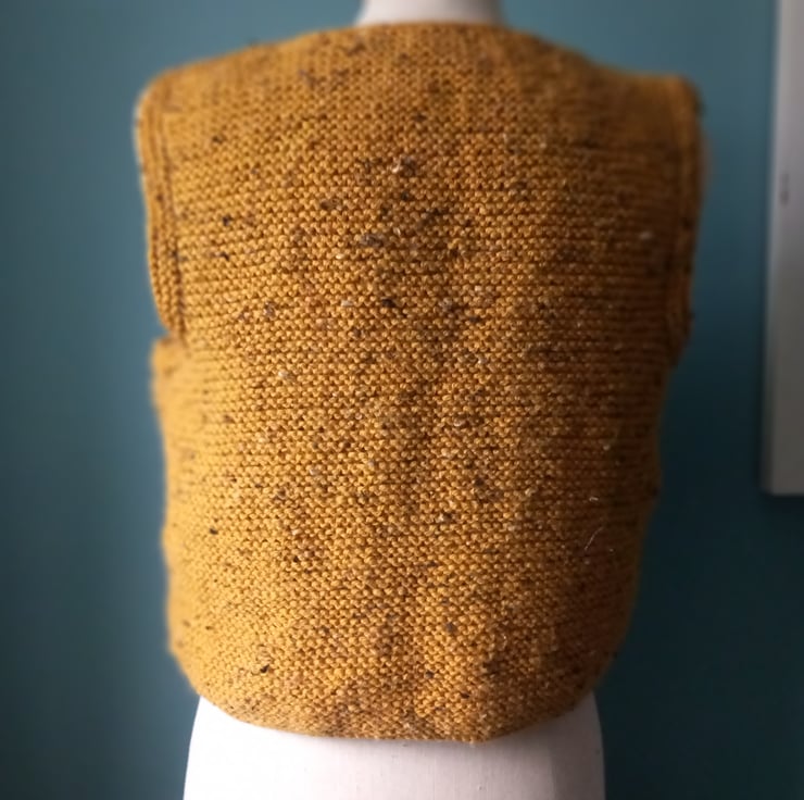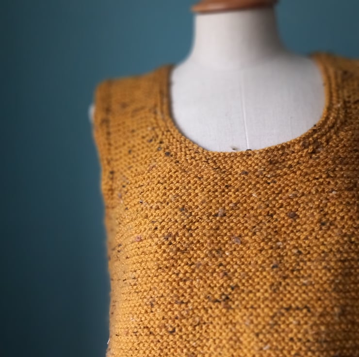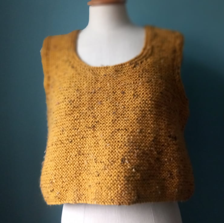 This autumnal tank top is a boxie shape. Hand knitted by my lovely mum in Rutland. Wool with some acrylic so it will keep it's shape. A comfortable size 12. A fleckie mustard.
