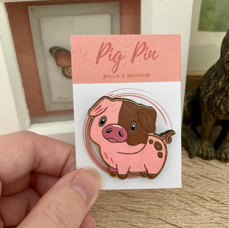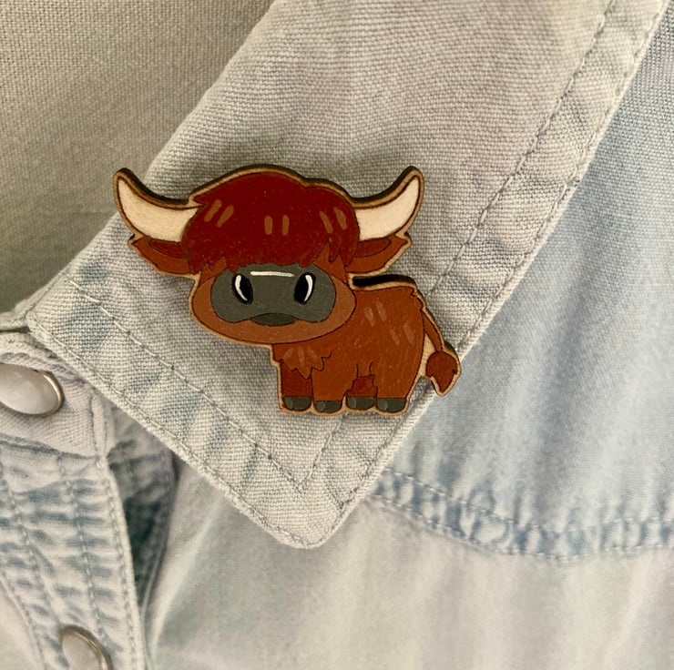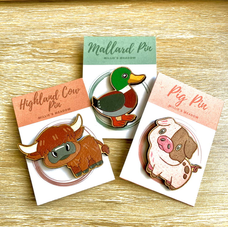 This is a cute set of farm animal pin badges featuring a Highland cow , Mallard duck and a Pig.