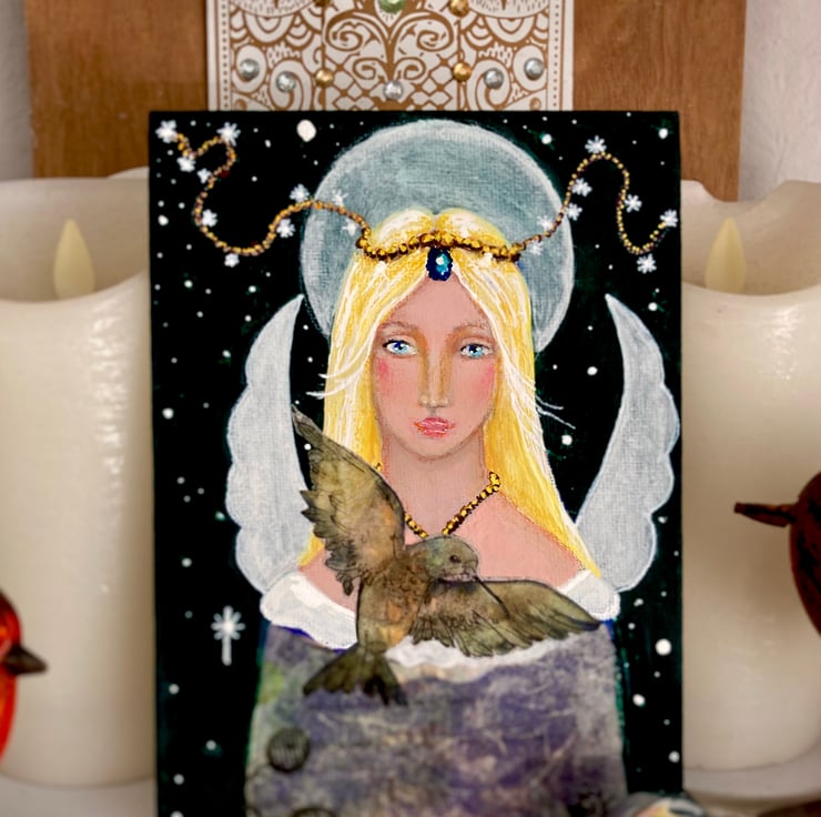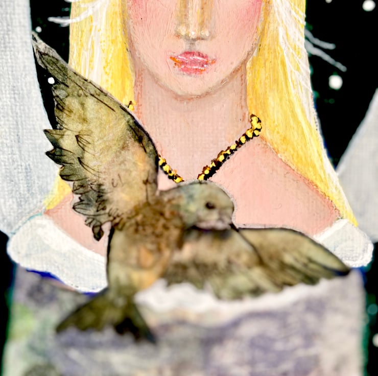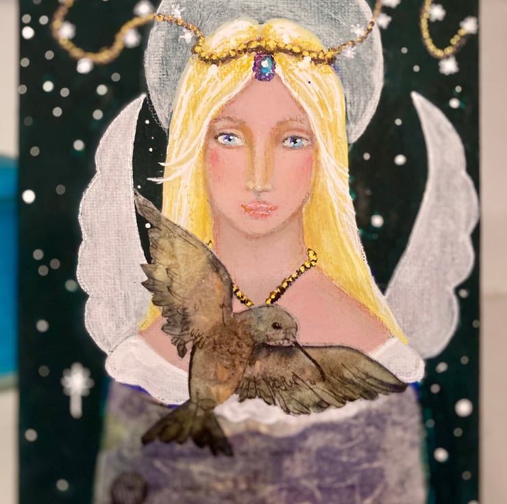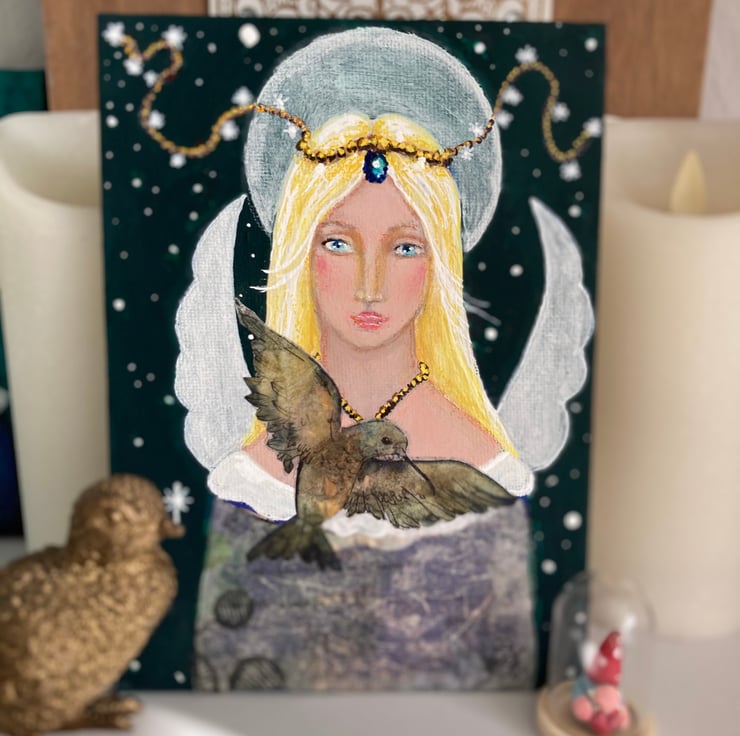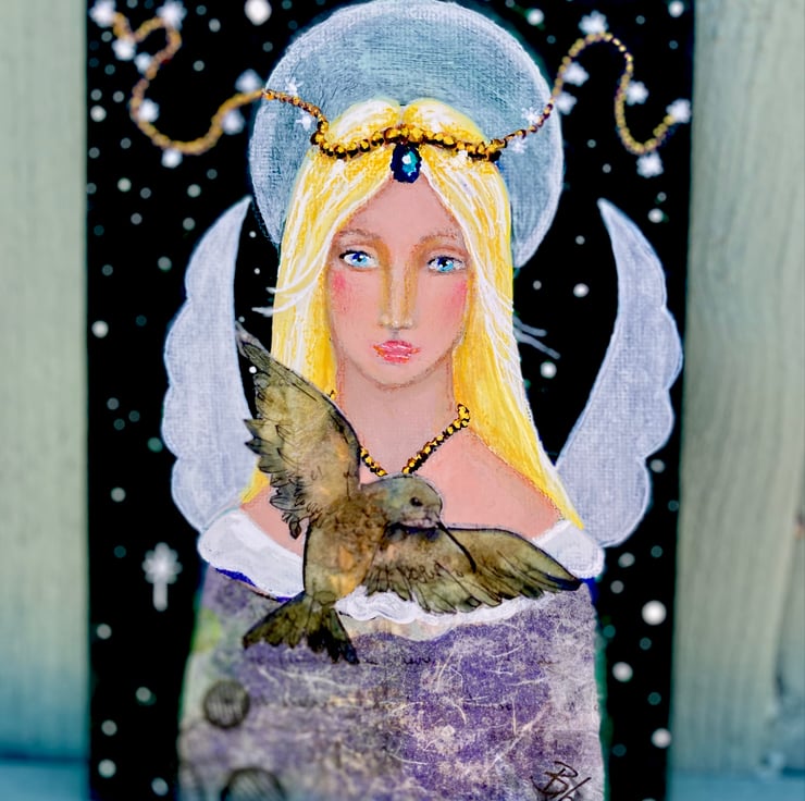 Folk Art Style Angel And Hummingbird Acrylic Paintintg On Canvas Board
