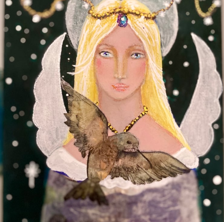 The angel has golden hair and wears a headdress full of stars with a deep blue jewel restinf on her forehead.