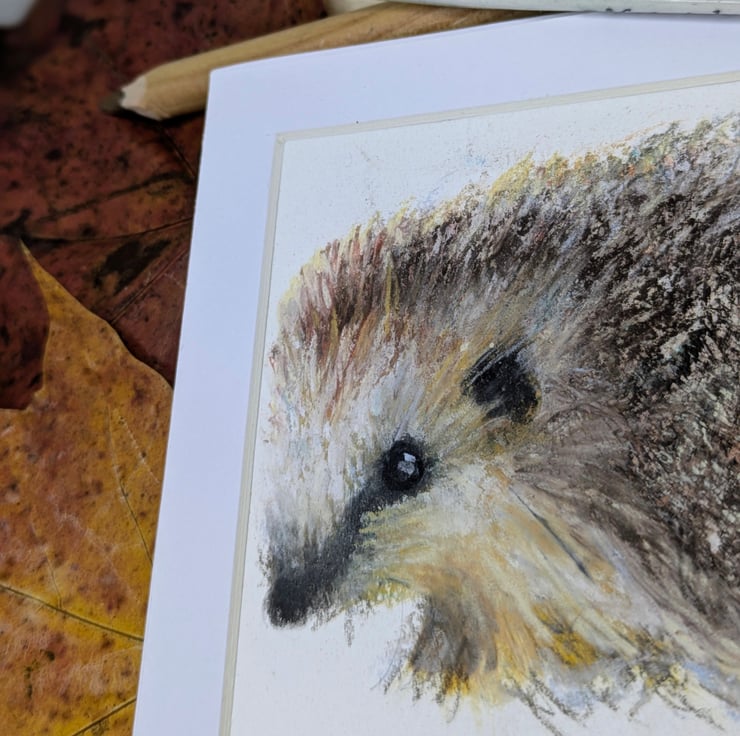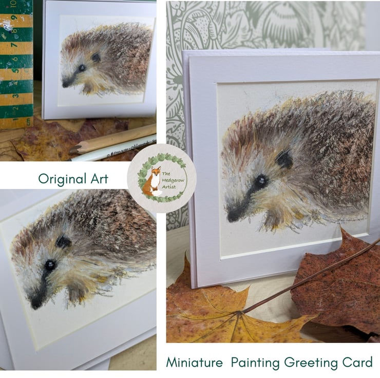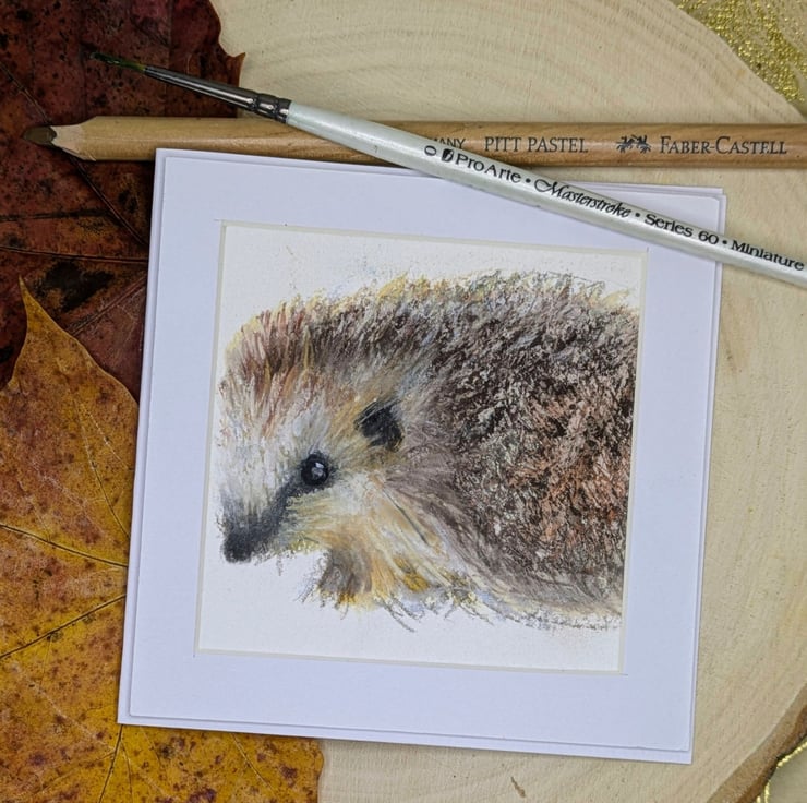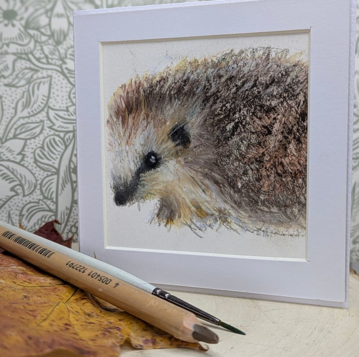 This little mixed media hand painted hedgehog has been mounted on to a blank greeting card and framed with a white mount so it is both card and gift in one. The perfect gift you can pop in the post. Or you could send it with a small box frame made for images 10x10cm even better keep it for yourself.