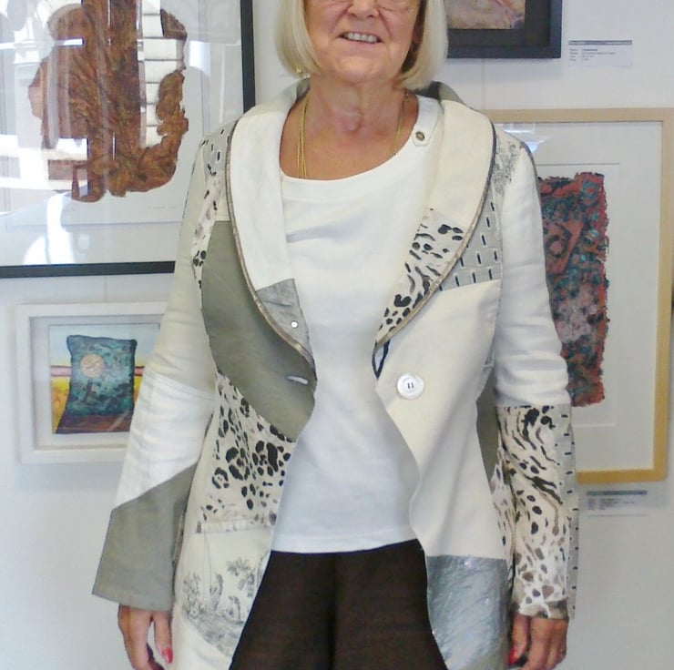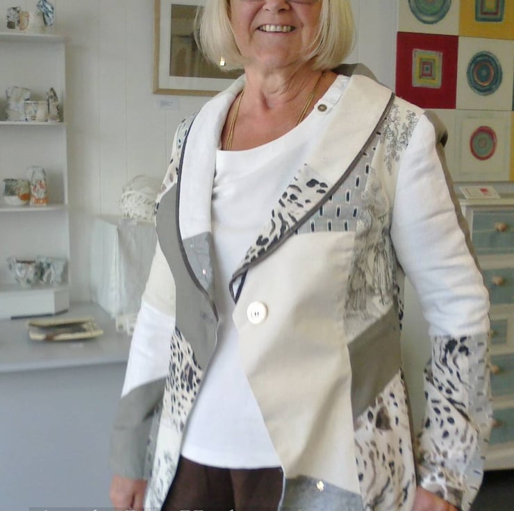 Elegantly shaped white and grey summer jacket in patchworks of linen, viscose and cotton. Narrow sleeves, jacket can be worn with vest under for special occasion. Traditional rural linear styled illustration scenes of damsels under trees black printed on white thick cotton. Faux leather edged rolled collar and seam pockets. Vogue pattern: flared to hips, cut away front lines with one large pearl button.