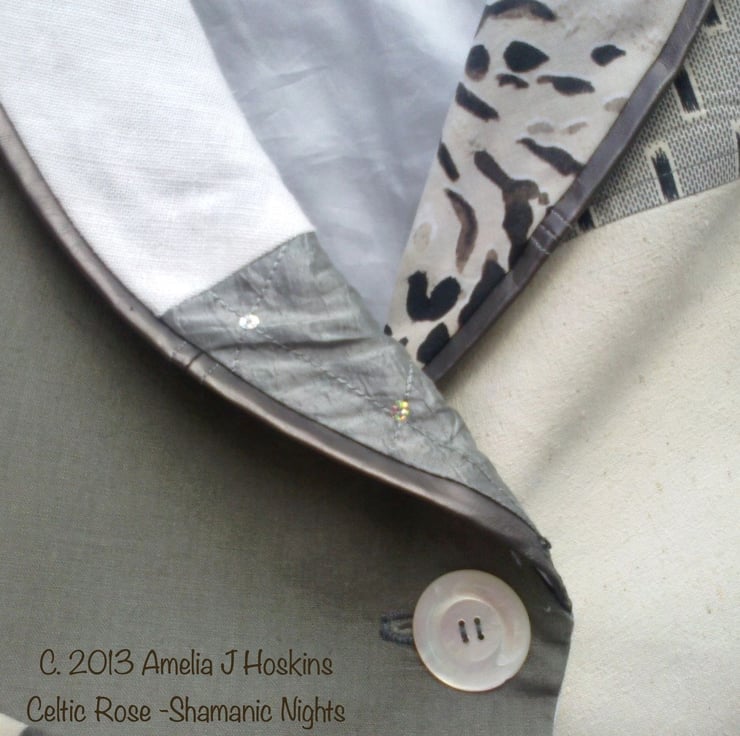 White linen and cream flecked silk the starting point. I enjoy matching prints as patchworks: in grey, silver and 3 prints.