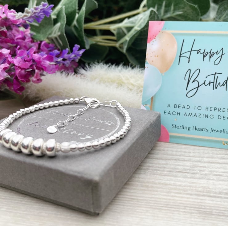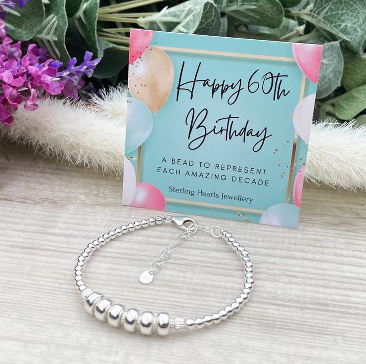 This is a dainty sterling silver 60th birthday bracelet, which features 6 rondelle beads to represent each wonderful decade. This bracelet makes a perfect gift for anyone celebrating their milestone 60th birthday.