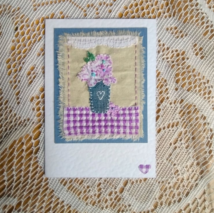 The vases are made from recycled denim with a white stitched edging and a little white stitched heart, filled with purple fabric flowers, embellished with tiny blue beads and embroidery.