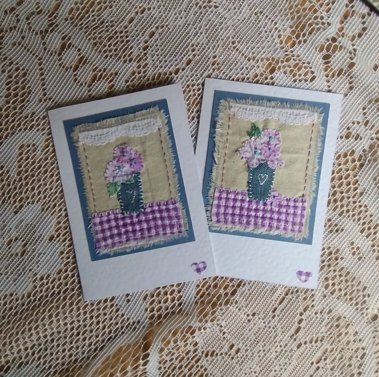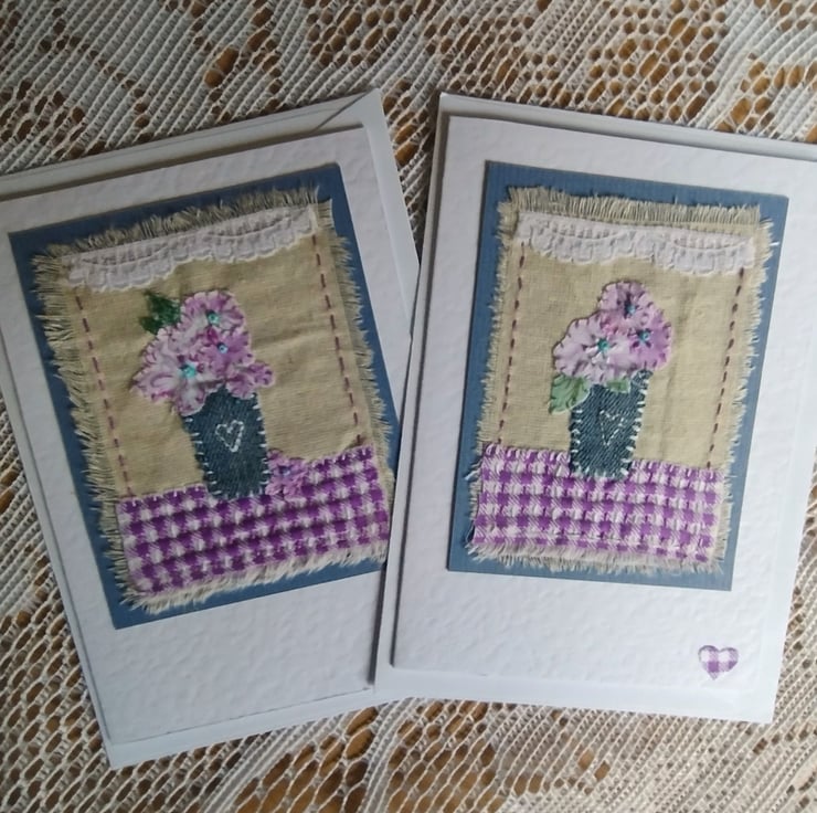Set of two pretty vase of flowers textile greeting cards, created from folded white hammer textured card, blue card, natural raw edged calico, small pieces of fabric, beads, lace and embroidery threads.