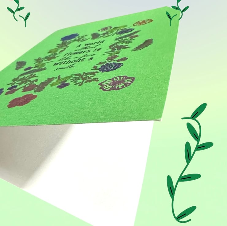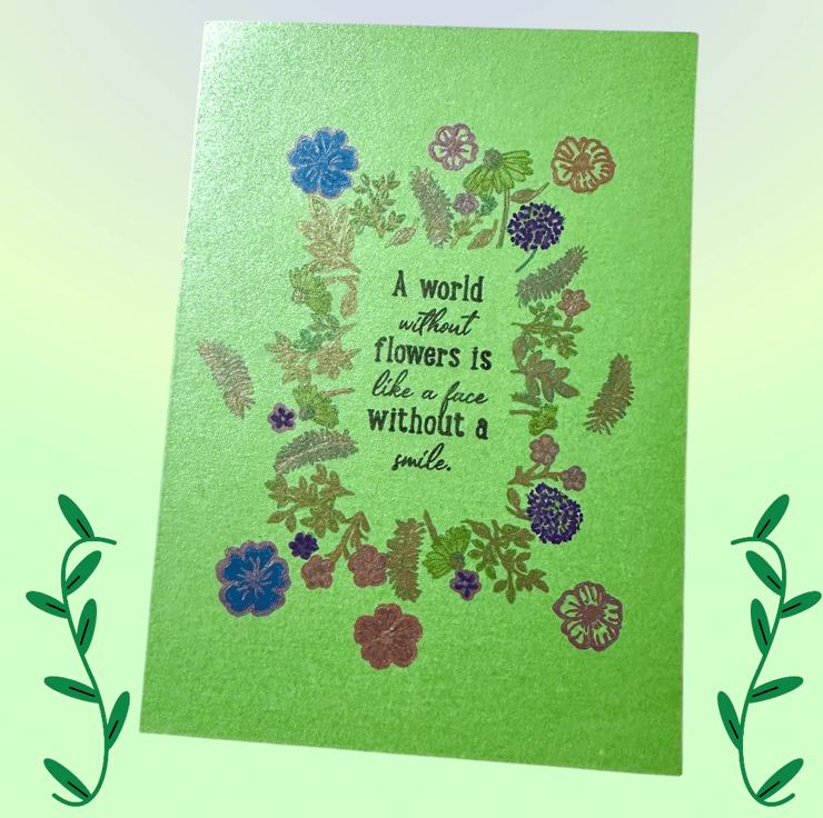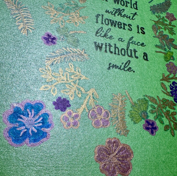 This large and vibrant A5 card has a shimmery pearlescent background with a basic stamp enhanced by hand painting flowers, ferns and leaves. The shiny metallic inks catch the light in greens, pinks, blues, yellow with golden accents.