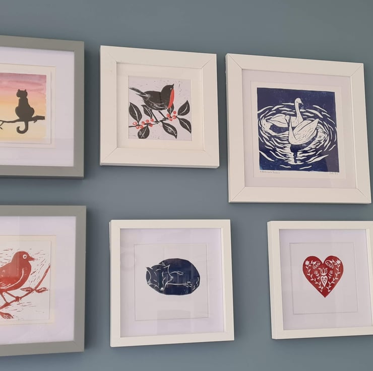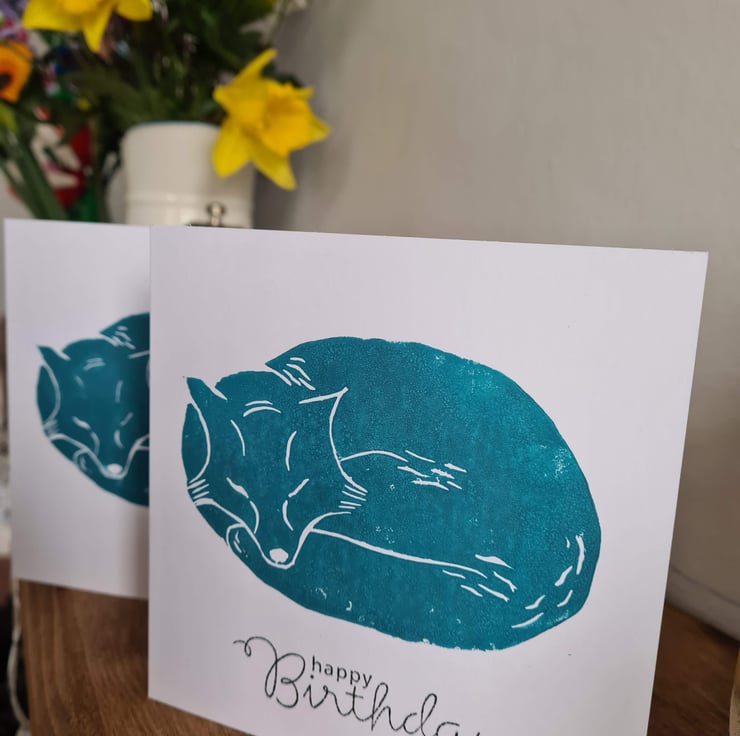 This handprinted sleeping fox card is from a linocut that I have designed and carved myself. I enjoy drawing birds and woodland animals and had fun creating this fox linocut. It is available with 'happy birthday' on the front, or without text, so it could be framed if desired (see photo for some of my cards in frames).