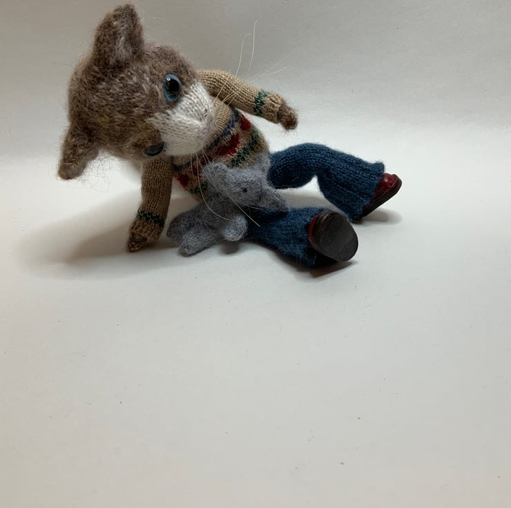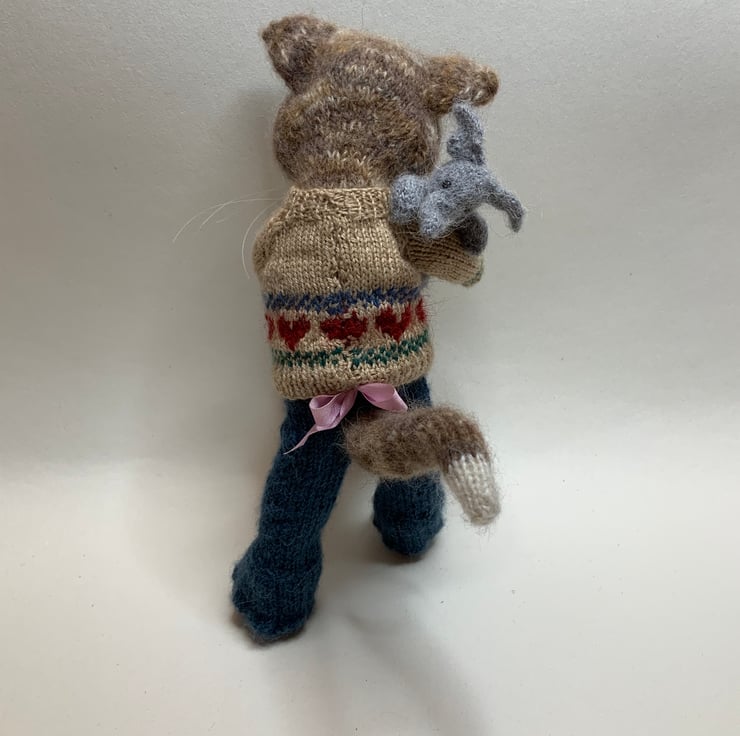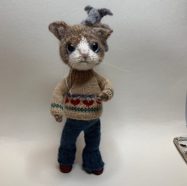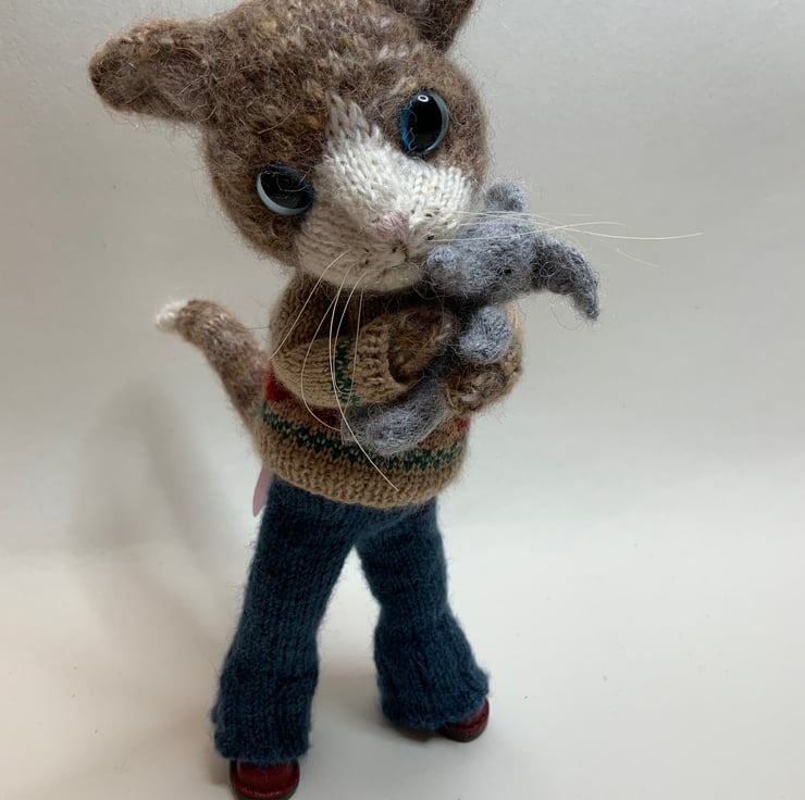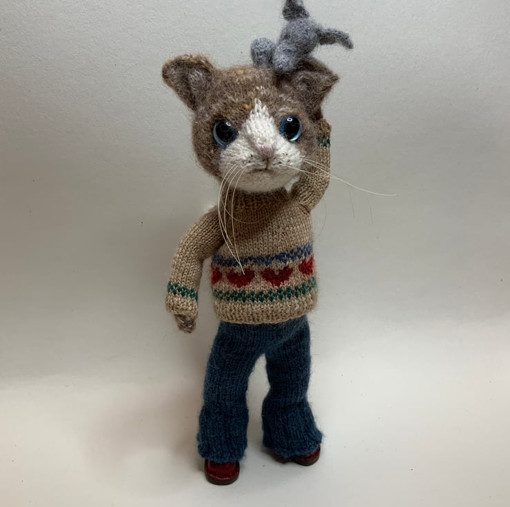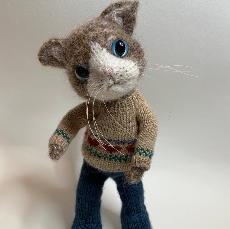 Hand Knitted by me using a mix of soft Alpaca and silk yarns and the Dot Pebbles Cat Doll pattern.