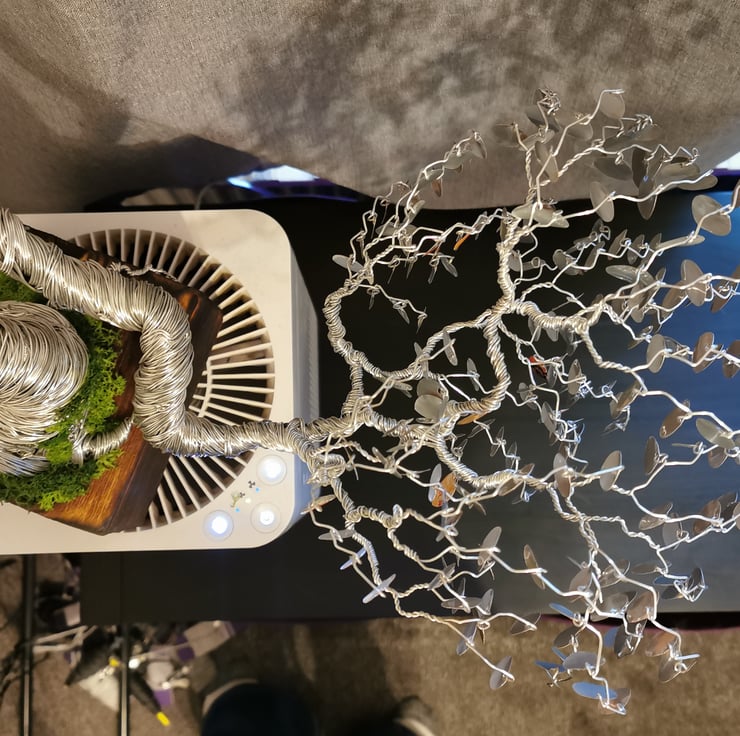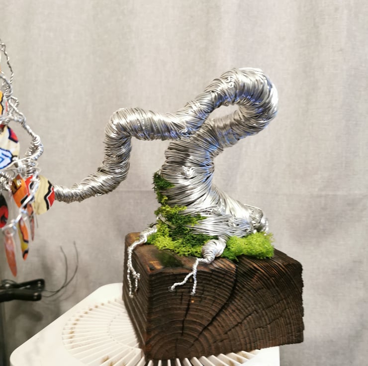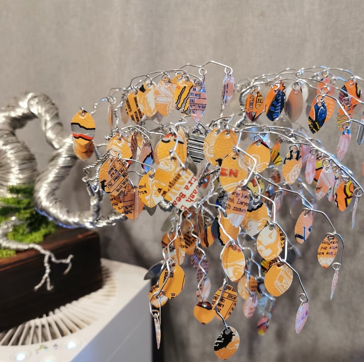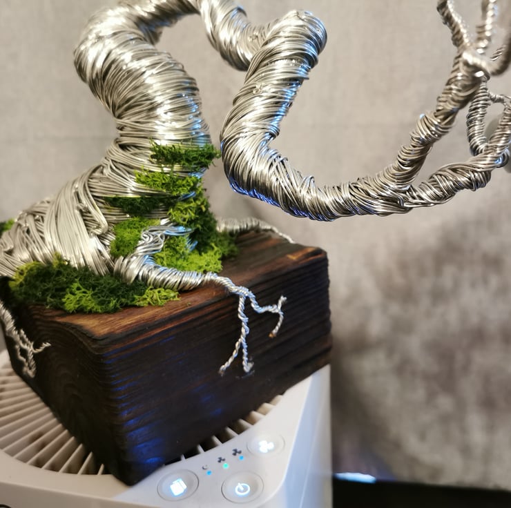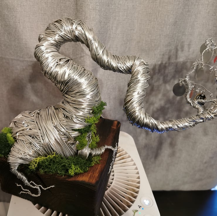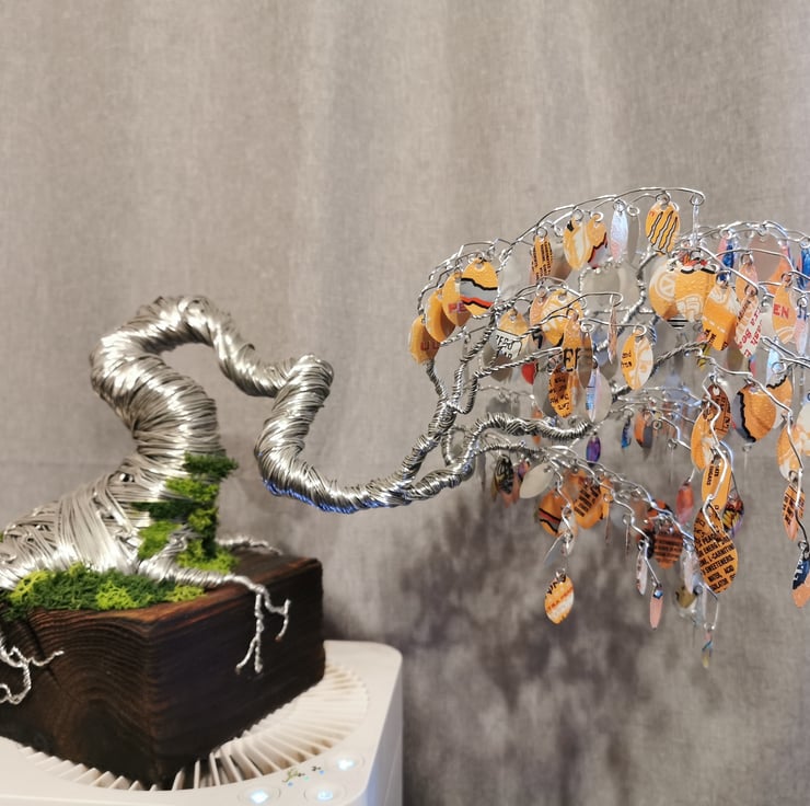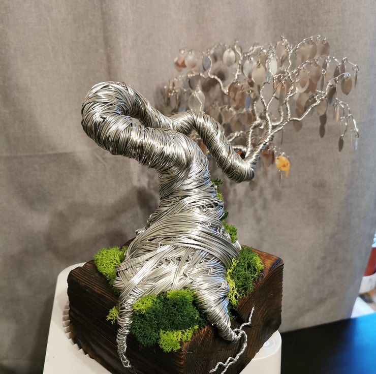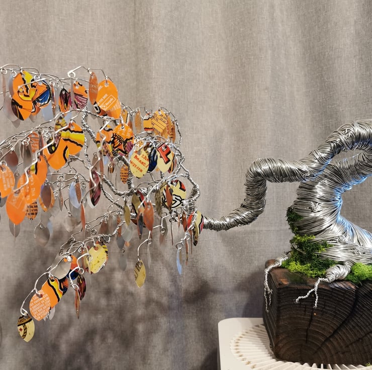 Beautiful handmade wire Bonsai tree sculpture. The trunk is made from aluminium silver wire and foliage is made of recycled Monster cans. The tree is based on stunning piece of wood, burnt to preserve and finished with varnish. It will be a fantastic eye catching piece of art in any room.