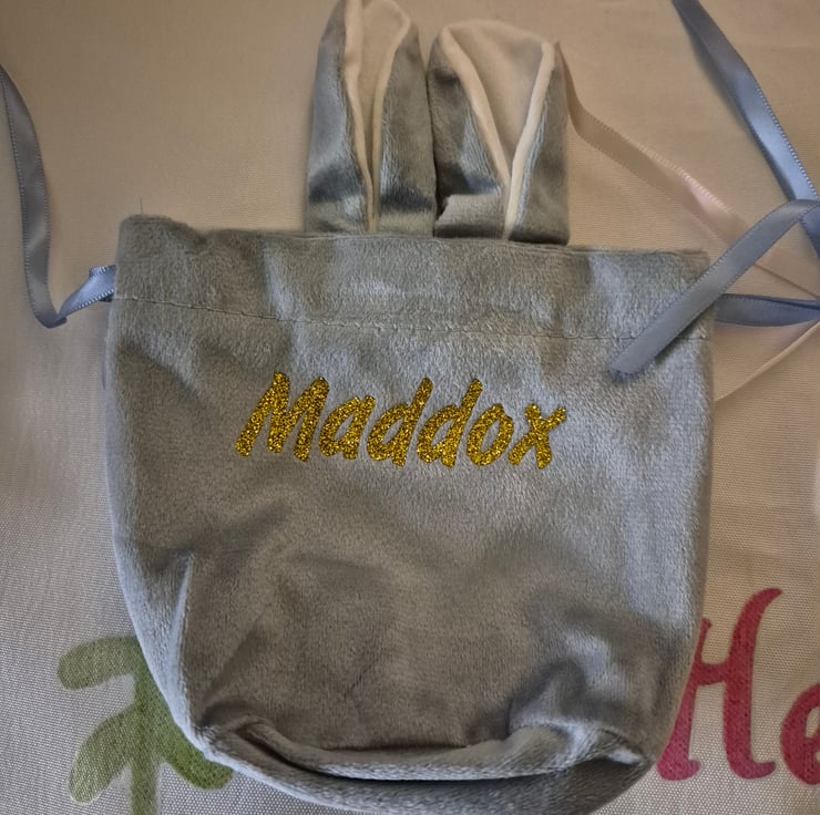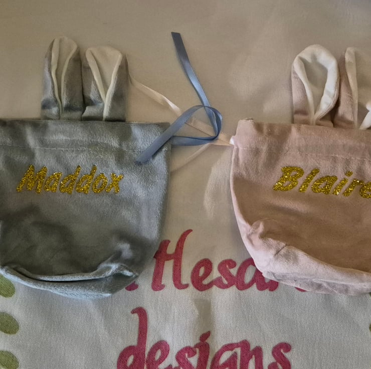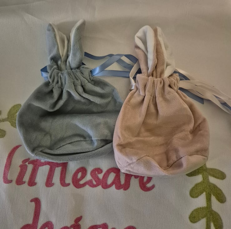 Gorgeous bunny ears treat bags. Can be personalised. Options are blue, pink or red. 13cm x 12 cm before ear height. 13 x 16 with ear height included. Drawstring closure.
