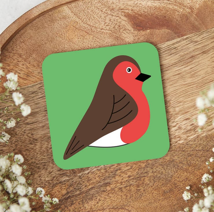 Colourful robin coaster designed by Carolyn and made in the UK using a sustainably sourced eucalyptus board base. It has a lovely, glossy melamine surface and cork backing.