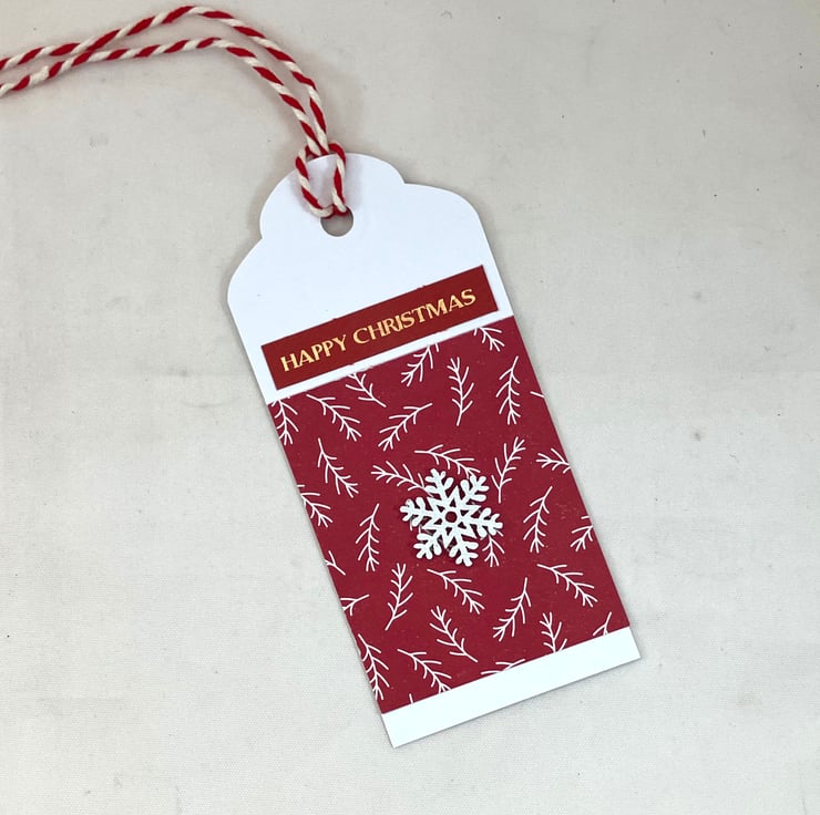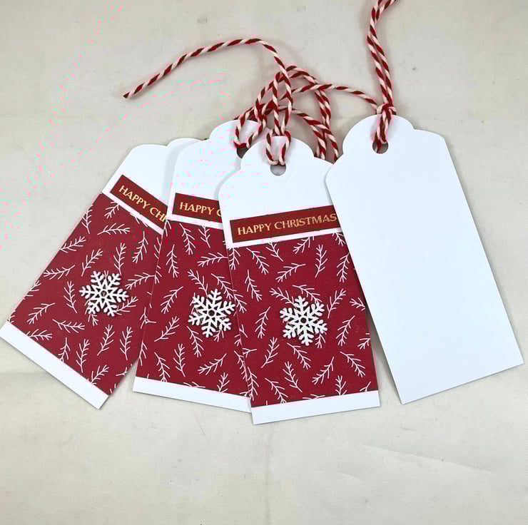 Pack of 4 Christmas gift tags (each with same design). Each tag has a red background paper with white foliage. On top of this is a small white, wooden snowflake. A gold foiled sentiment 'Happy Christmas' is at the top of the tag, which is strung with red and white baker's twine. The reverse side is blank.