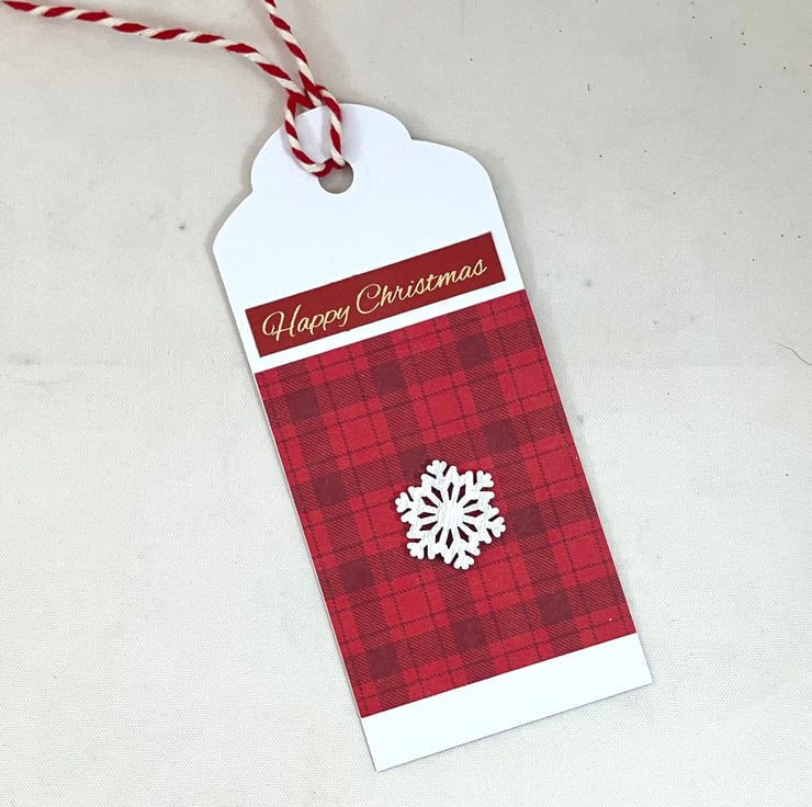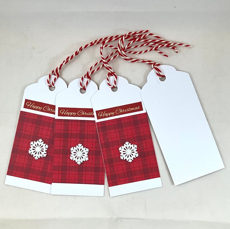 Pack of 4 Christmas gift tags (each with same design). Each tag has a red tartan background paper, on top of which lies a small white, wooden snowflake. A gold foiled sentiment 'Happy Christmas' is at the top of the tag, which is strung with red and white baker's twine. The reverse side is blank.