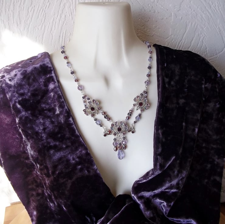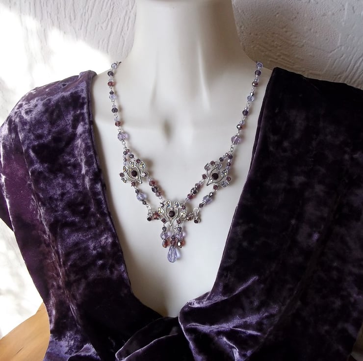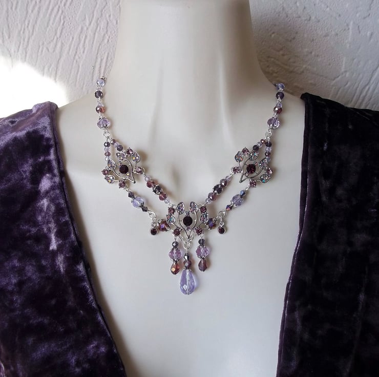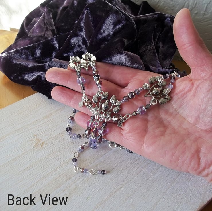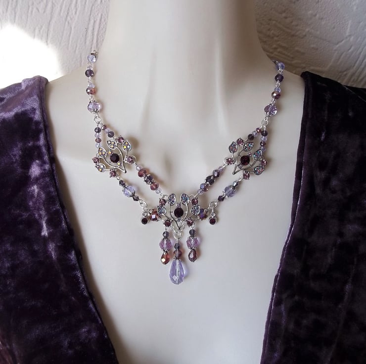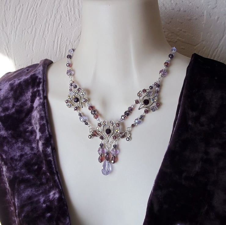 Stunning Diamante & crystal glass beaded necklace in a myriad of purple from pale violet to dark amethyst. Three thistle styled rhinestone set adornments, two tiny round rhinestone set drops & a multitude of faceted round, rondelle, bicone & teardrop glass beads. I have accented here & there with a smattering of silver tone flower petal bead caps & finished the piece off with a beaded extender chain. Fastens to the back with a silver plated lobster claw clasp. The last photo shown of this necklace is a back view so that you can see how it has been constructed.