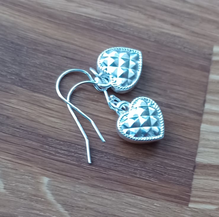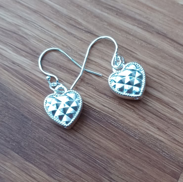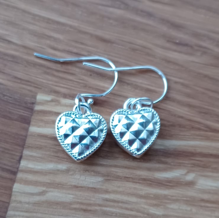 Patterned Sterling Silver heart pierced earrings with reversible diamond pattern.