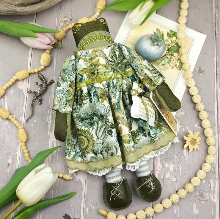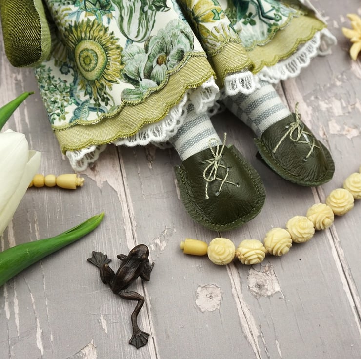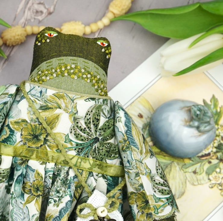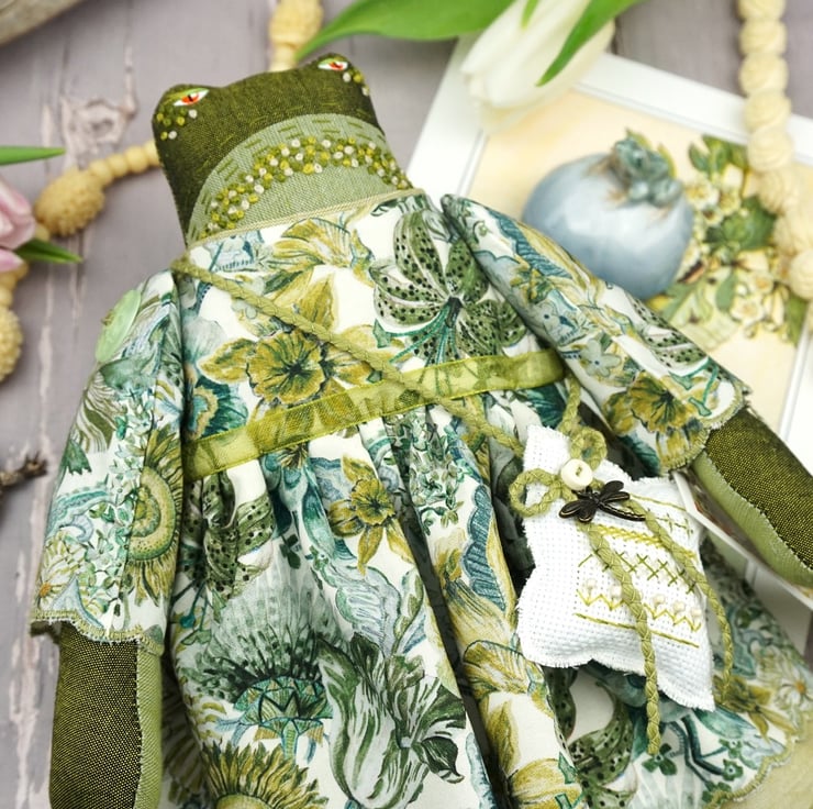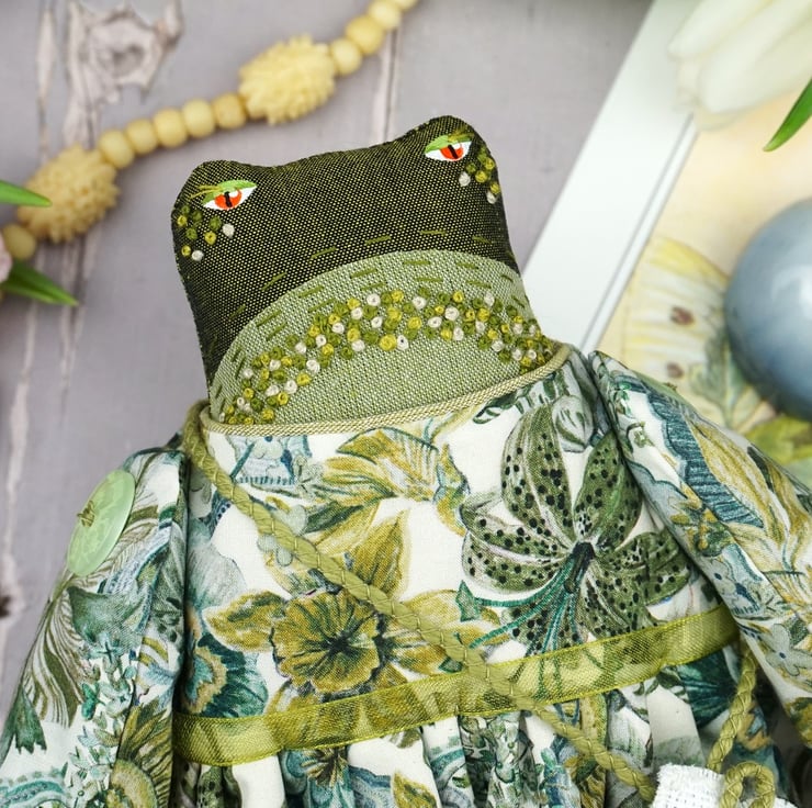 Maysant is a tiny river frog dressed in lovely river green Liberty poplin called Wonder Garden from the Piccadilly Range. She has white broderie anglais drawers with green cotton and white tulle petticoats.