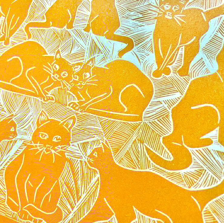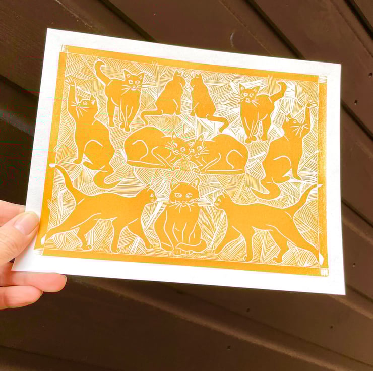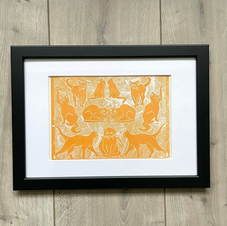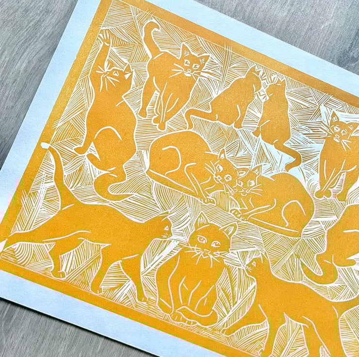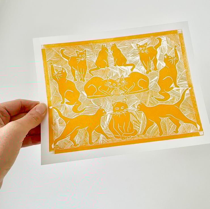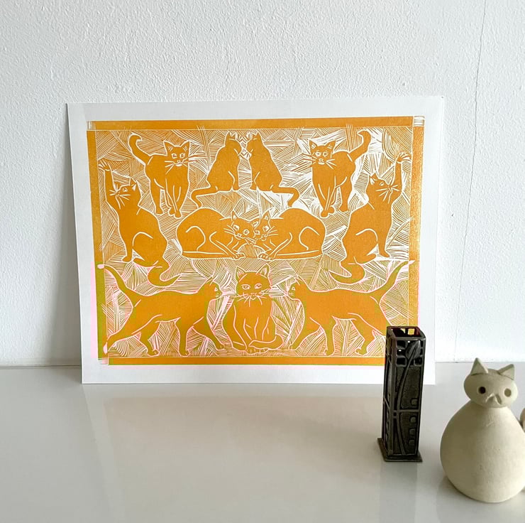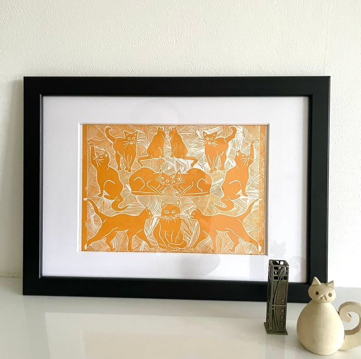 An original lino print of cats with a hint of art deco style. This is the perfect gift for any cat lover - young or old!