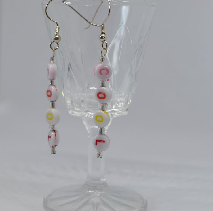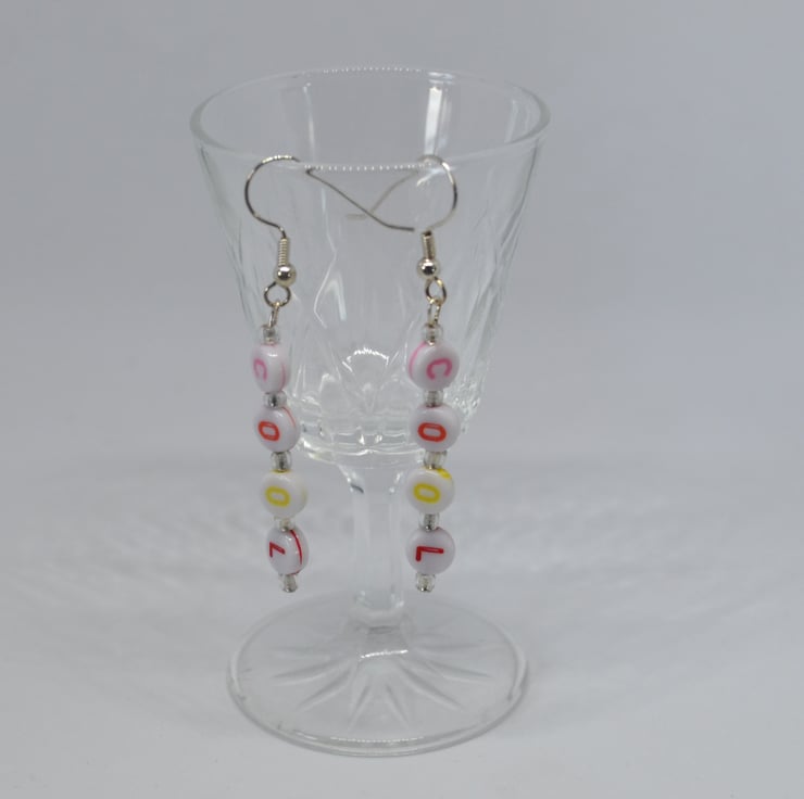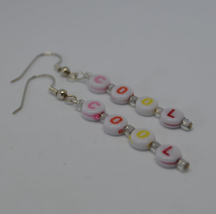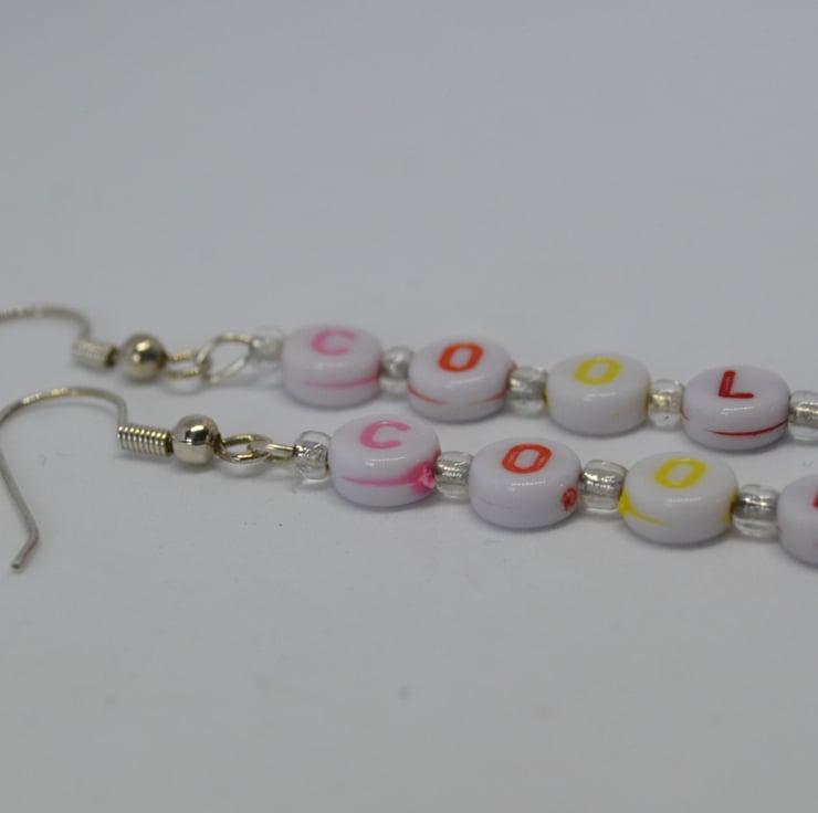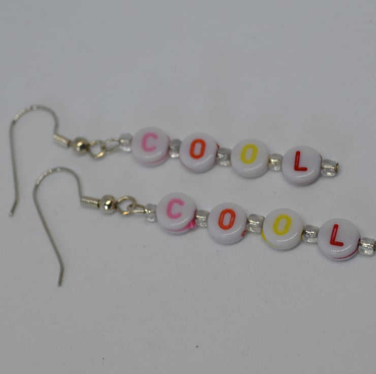 A trendy pair of earrings for those that like something a little bit novel. This pair is made using acrylic flat round discs with colourful letters placed to make the word "cool". They are nice and lightweight and have a drop of approx. 4cm from the base of the silver plated ear wires and they are approx. 0.7cm in width. A nice little treat for someone who likes a bit of fun.