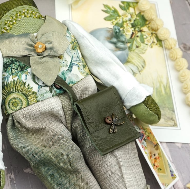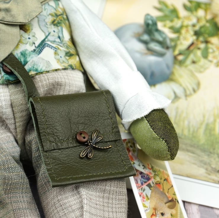 He has fennel and rosemary in his stuffing, hand painted and embroidered features. He has a piece of river glass from the Yarrow at his heart for warmth and is finished with tiny buttons, a foraging bag in leather with strong leather galoshes for stomping down by the river