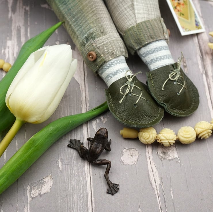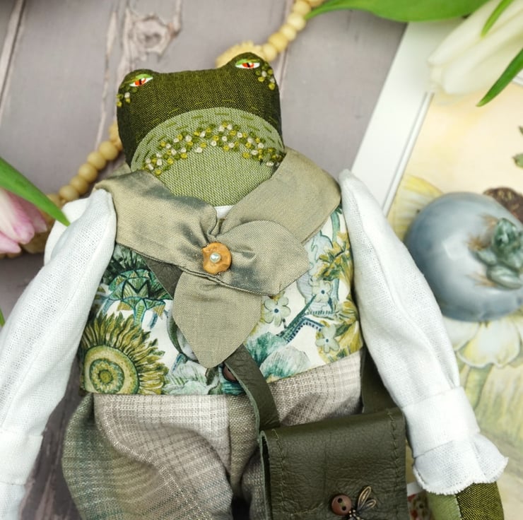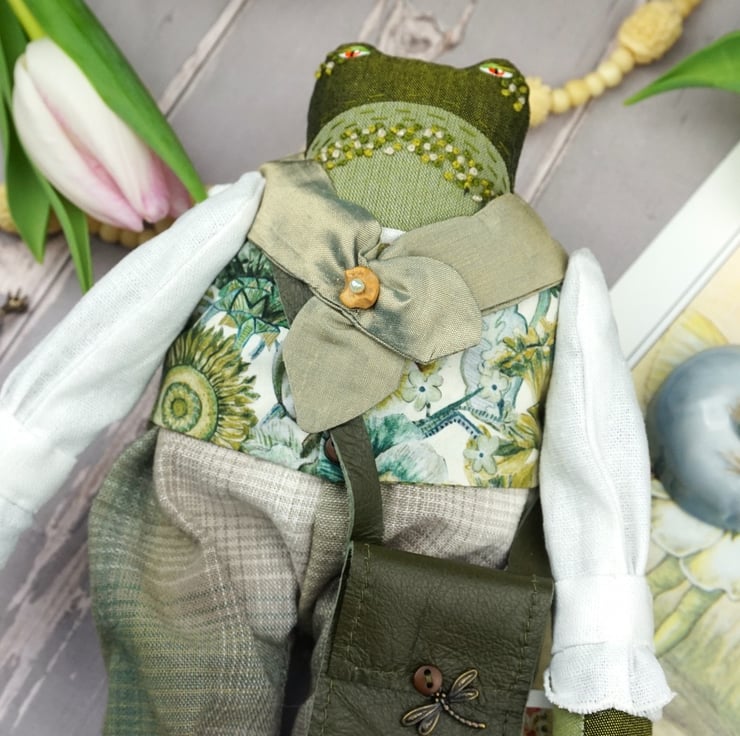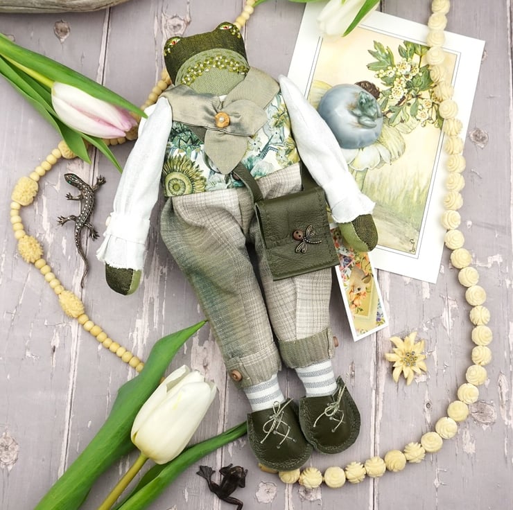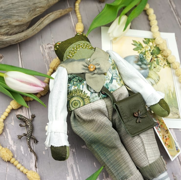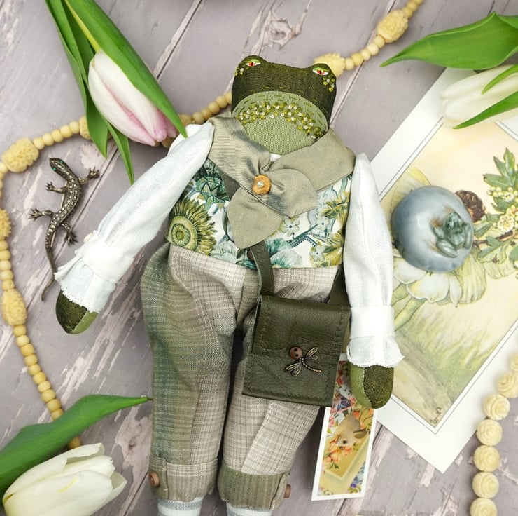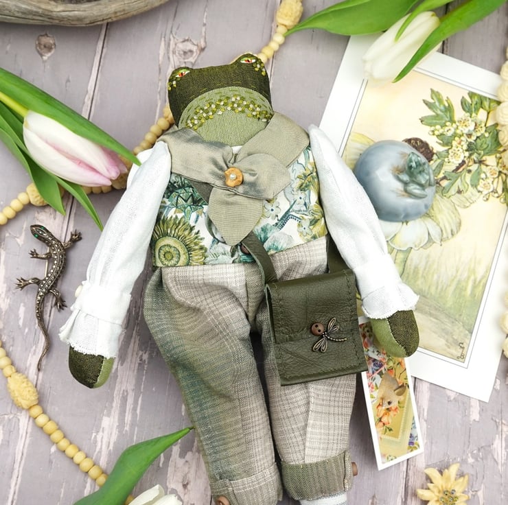 Samer is a tiny river frog dressed in lovely river green tweedy yarn dye fabrics from Japan, a smart cuffed shirt with a waistcoat in a Liberty Piccadilly Poplin called Wonder Garden. His cravat is of tawny silk.