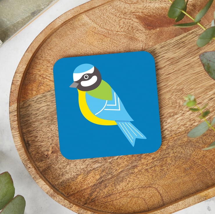 Colourful blue tit coaster designed by Carolyn and made in the UK using a sustainably sourced eucalyptus board base. It has a lovely, glossy melamine surface and cork backing.