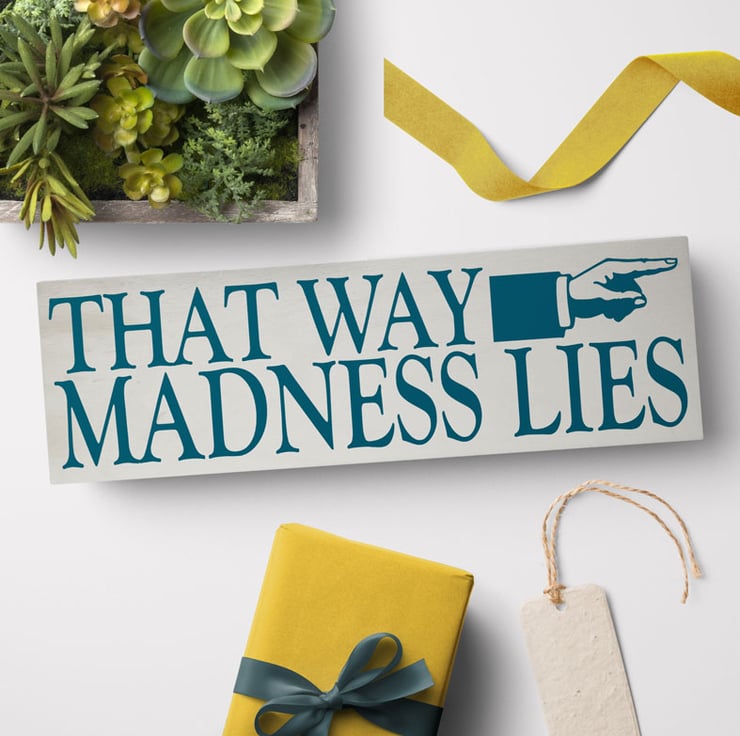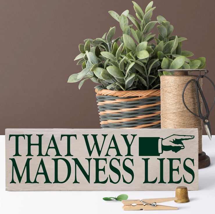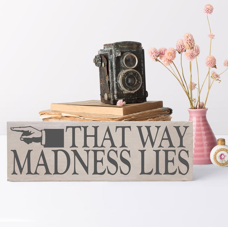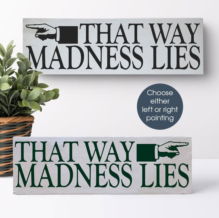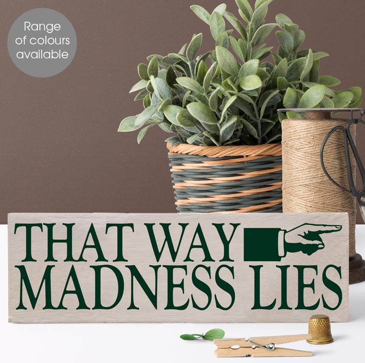 Be careful which way you turn, that way madness lies! Position this fun wooden sign in the right place (pointing towards or away from something - you can request the sign to be pointing left or right), and it will definitely raise a smile. With a little theatrical nod to Shakespeare, this bespoke wooden sign would also be fun in a workplace setting - perfect to give to a work colleague! A brilliant gift idea for all sorts of occasions, or a fun decor piece for your own home (I think it looks great in a hallway - pointing into the house, or outside, the choice is yours..!)