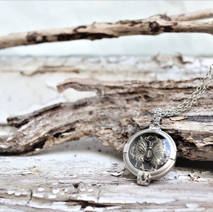 Upcycled watch case decorated with a vintage brass butterfly statement necklace