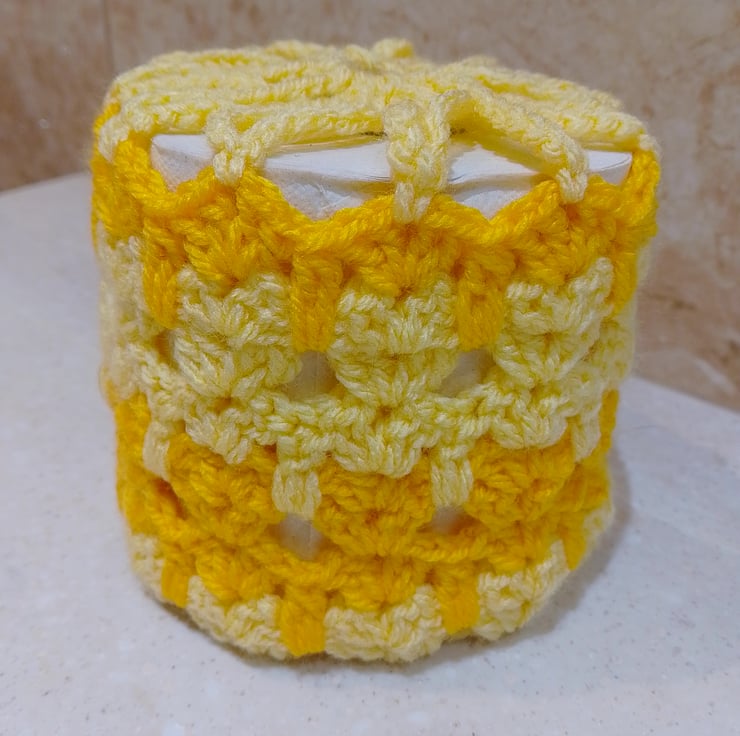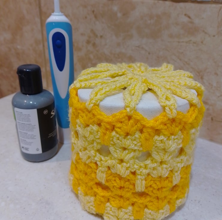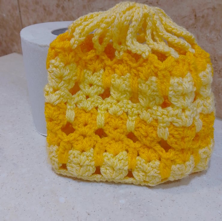 The cover is made from acrylic yarn and will fit a standard toilet roll.