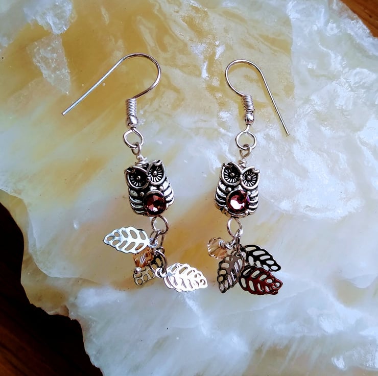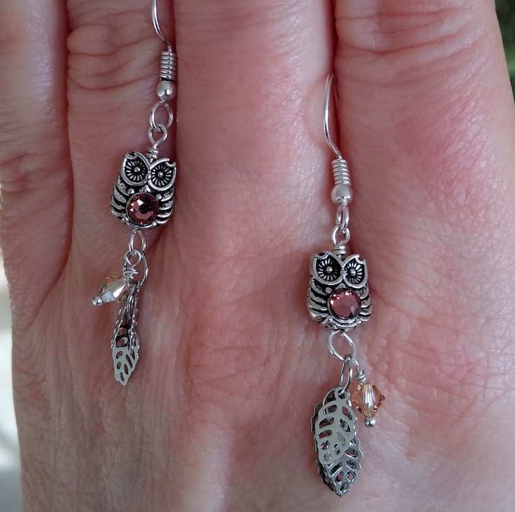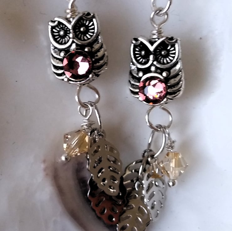Wise owl silver tone earrings with a sparkling tummy of Swarovski crystal element in coppery topaz colour. The owls are double sided so look good from the front or back. Suspended from the owl charm is a bunch of four tiny leaves and a faceted crystal to catch the light as they move.